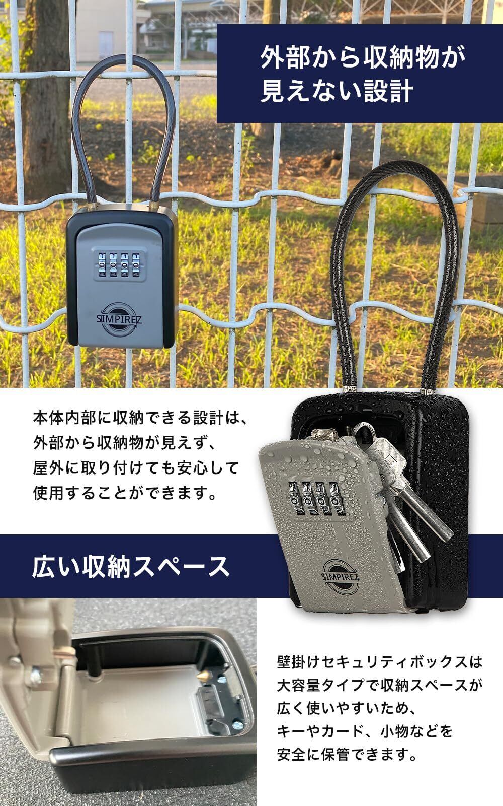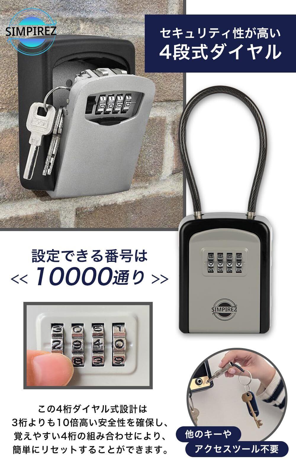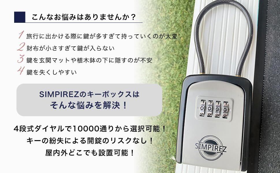 キーボックスの安全性と利便性 弊社のキーボックスは、セキュリティ性が高い4段式ダイヤルを採用しており、10000通りの設定番号 から選択が可能です。この4桁ダイヤル式設計は3桁よりも10倍高い安全性を確保し、覚えやすい4 桁の組み合わせにより、簡単にリセットすることができます。さらに、紛失して開けられなくなる心配 がないため、キーやその他のアクセスツールが不要です。また、本体内部に収納できる設計は、外 部から収納物が見えず、屋外に取り付けても安心して使用することができます。SIMPIREZキーボッ クスは安全性と利便性を両立した優れた製品です。