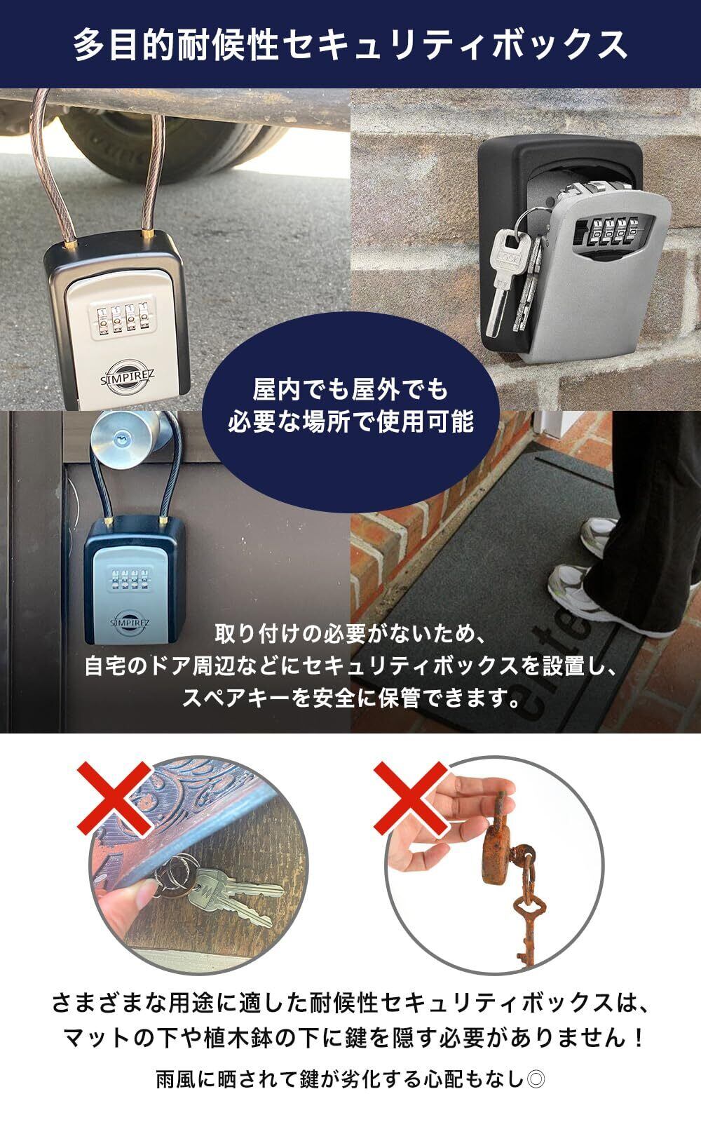 多目的耐候性セキュリティボックス さまざまな用途に適した耐候性セキュリティボックスは、マットの下や植木鉢の下に鍵を隠す必要が ありません。屋内でも屋外でも必要な場所の両方で使用できます。取り付けの必要がないため、自 宅のドア周辺などにセキュリティボックスを設置し、スペアキーを安全に保管できます。また子供が鍵 を持つのを好まない場合にも最適です。