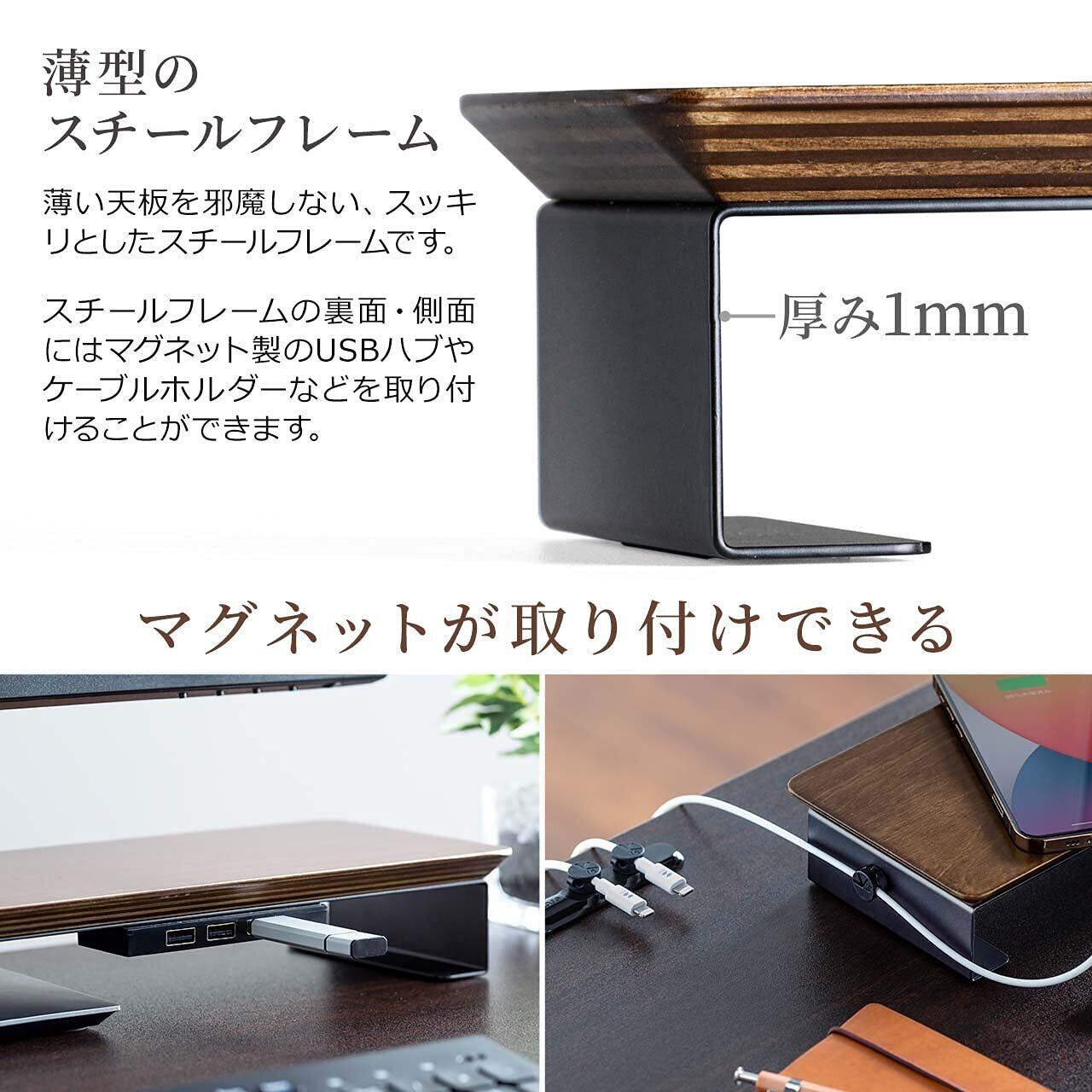 スチール製のフレーム部分にはマグネットを使ってUSBハブやカードリーダーなどを貼り付けることができます。