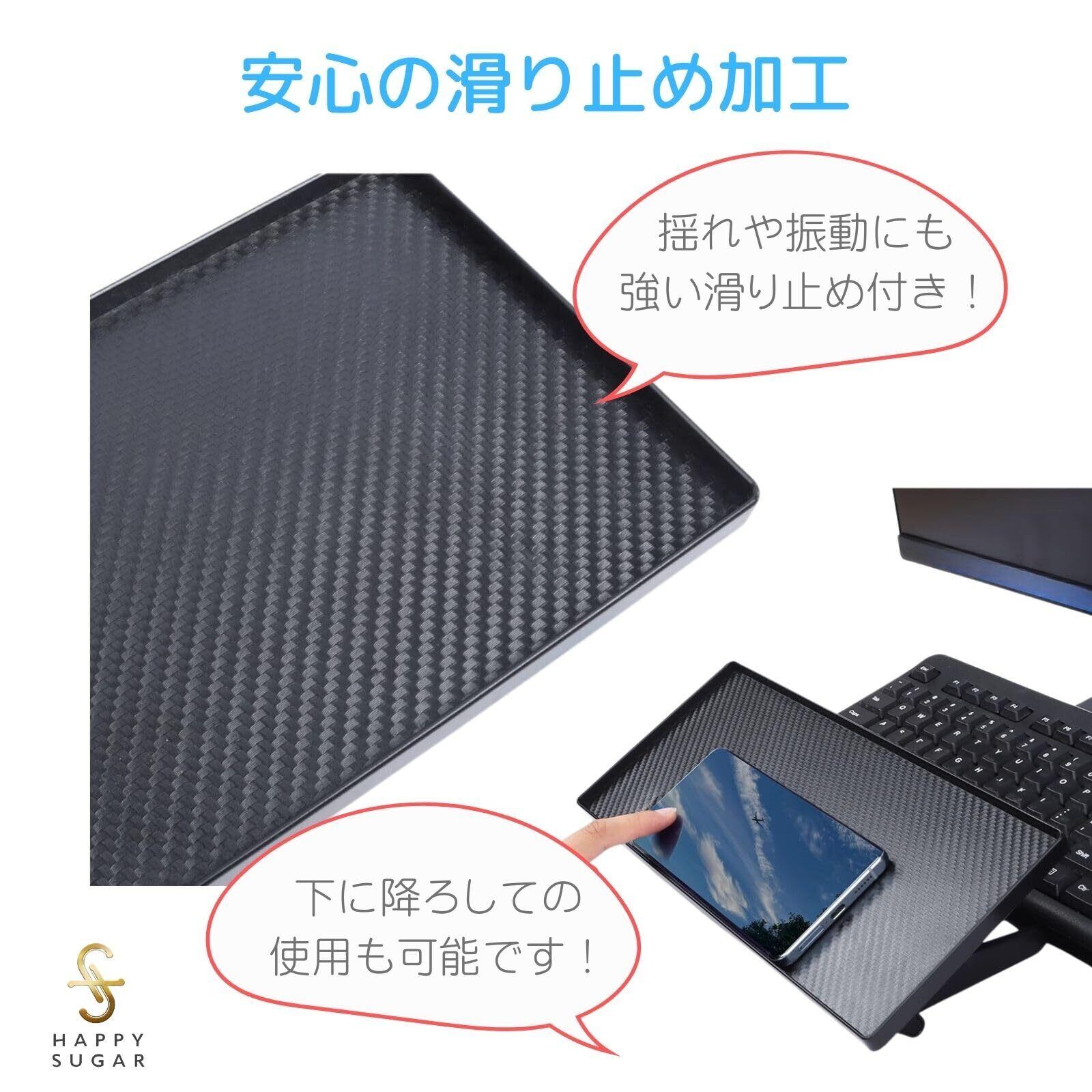 【滑り止めシート付き】ディスプレイボードには滑り止めシートが付いているため、揺れや振動があっても小物が落ちにくくなっています。安心して収納できる優れた機能です。