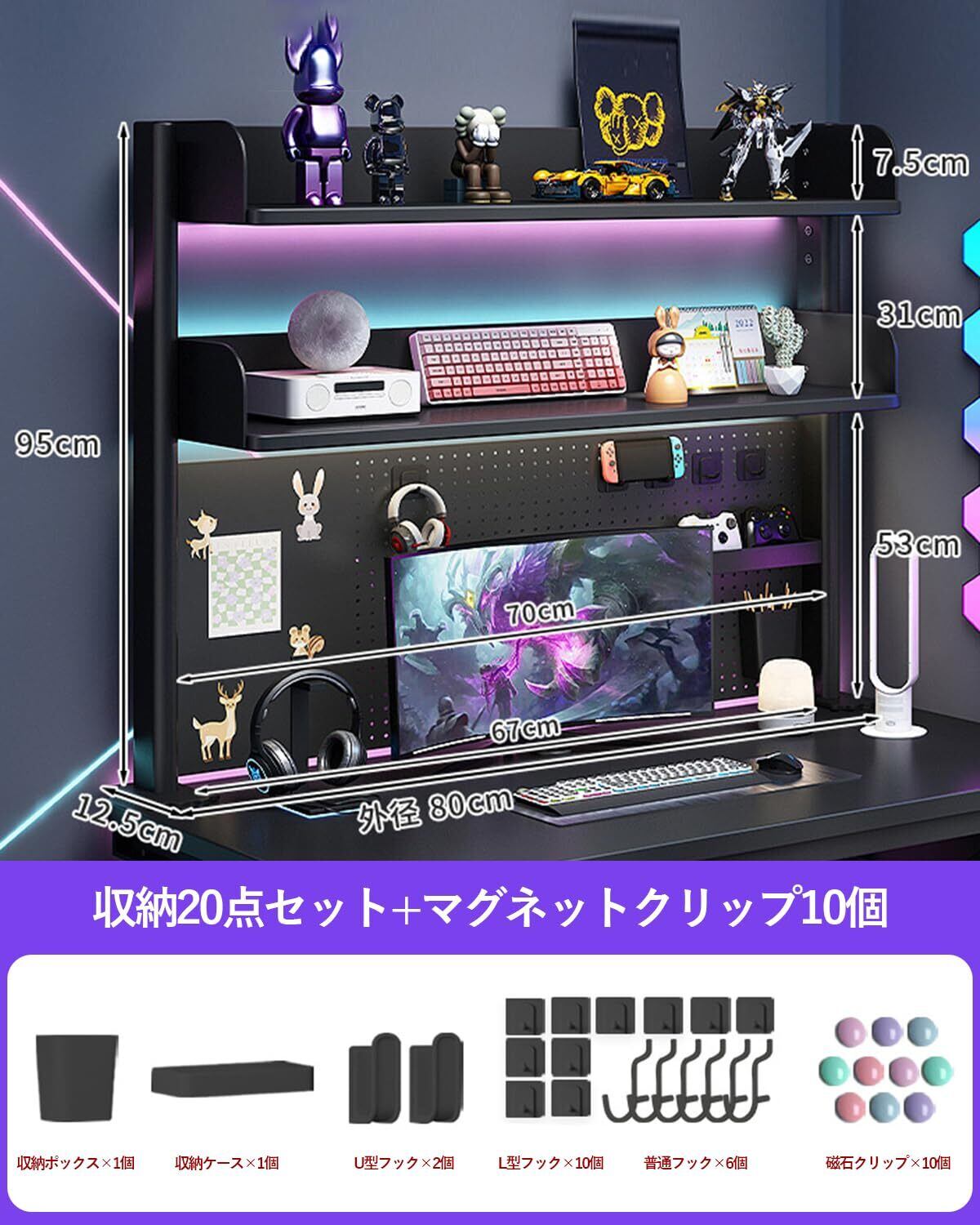 【豊富なアクセサリ】この収納ラックには、様々なアクセサリが標準で付属しています。収納ボックスやU字フック、Lフック、マグネットなどが含まれており、小物の整理に役立ちます。これらのアクセサリを活用することで、デスク上の空間をより有効に活用できます。