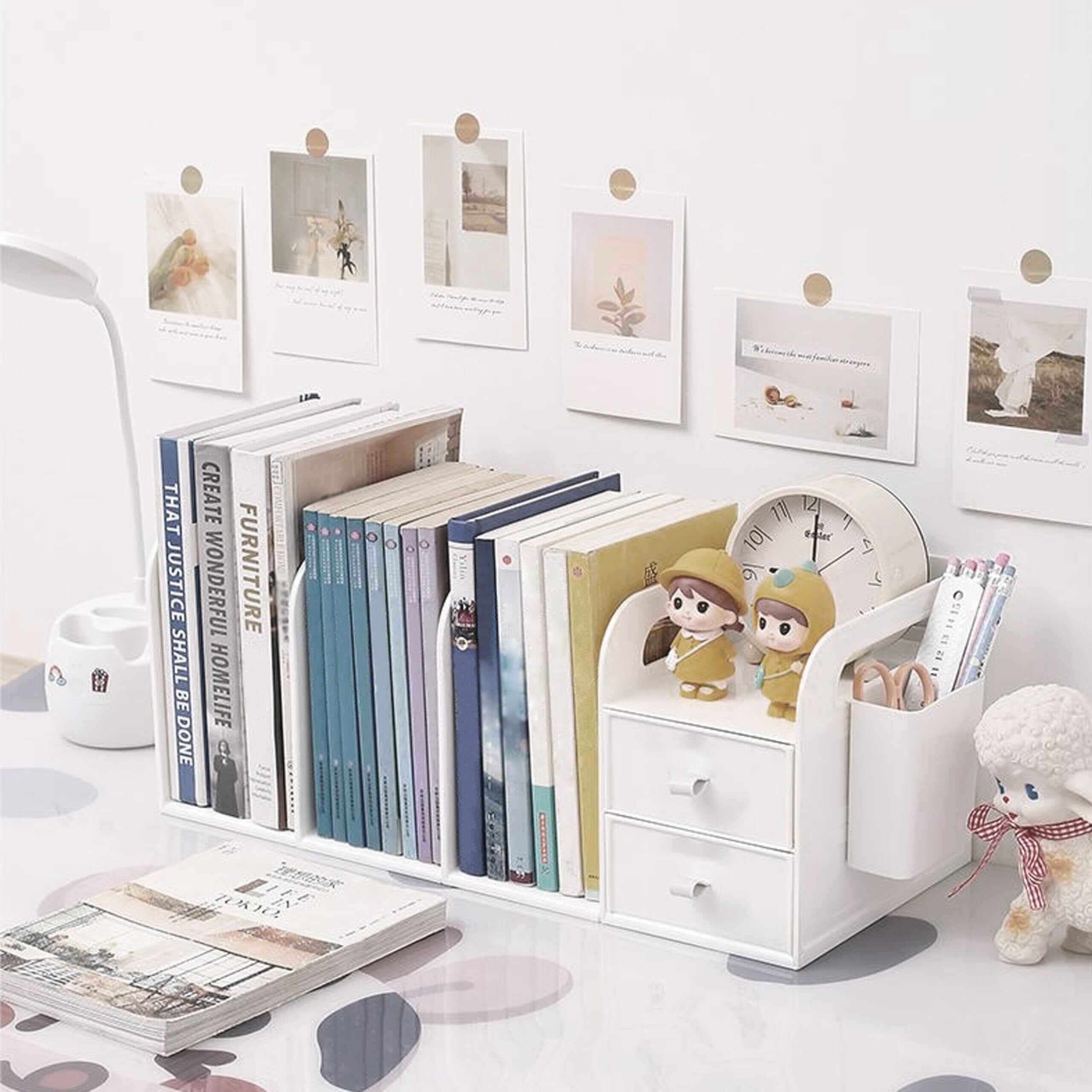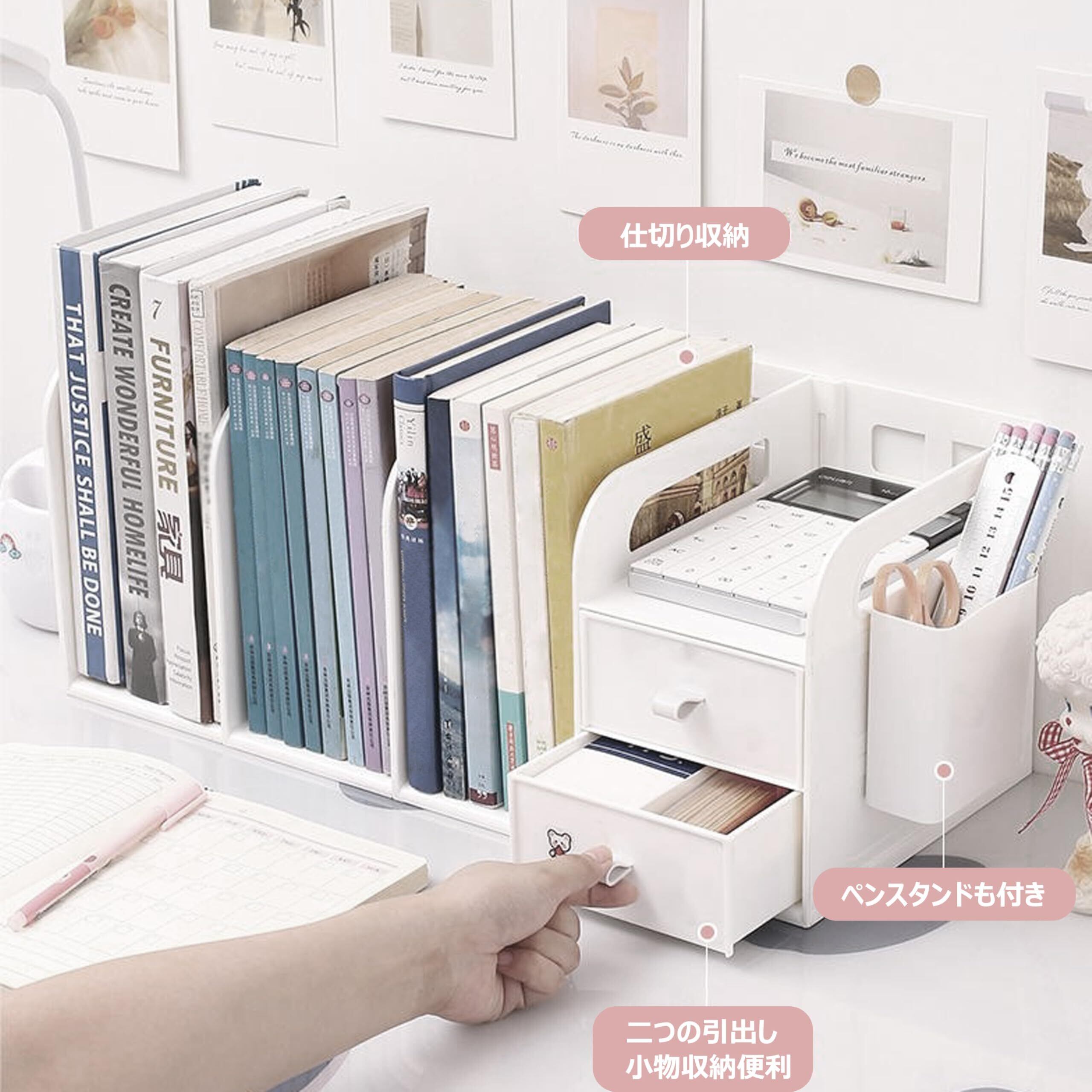 【多機能】卓上収納ラックは取っ手とペンホルダー付き、持ち運びに便利、鉛筆、ペン、印鑑、爪切り、眼鏡など、散らかりがちな小物を「簡単に」「美しく」整理できます。なめらかな曲線処理で、本や手を傷めません。