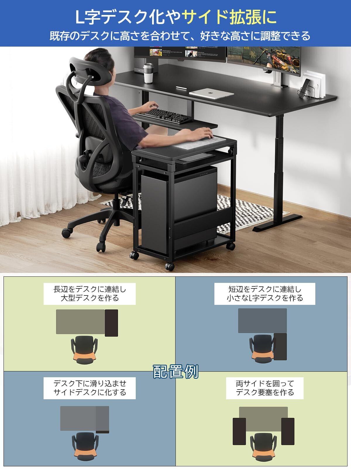 【理想のデスク拡張・L字環境を実現】作業効率UP。 デスクの高さにぴったり合わせられる昇降機能(71〜95cm)を搭載。お使いのデスク横に設置するだけで、手軽にL字デスクへと拡張できます。資料やノートPCを置く「追加の作業スペース」として活用でき、デスクトップがスッキリ片付きます。テレワークの効率化はもちろん、ゲーミング環境のアップグレードにも最適です。