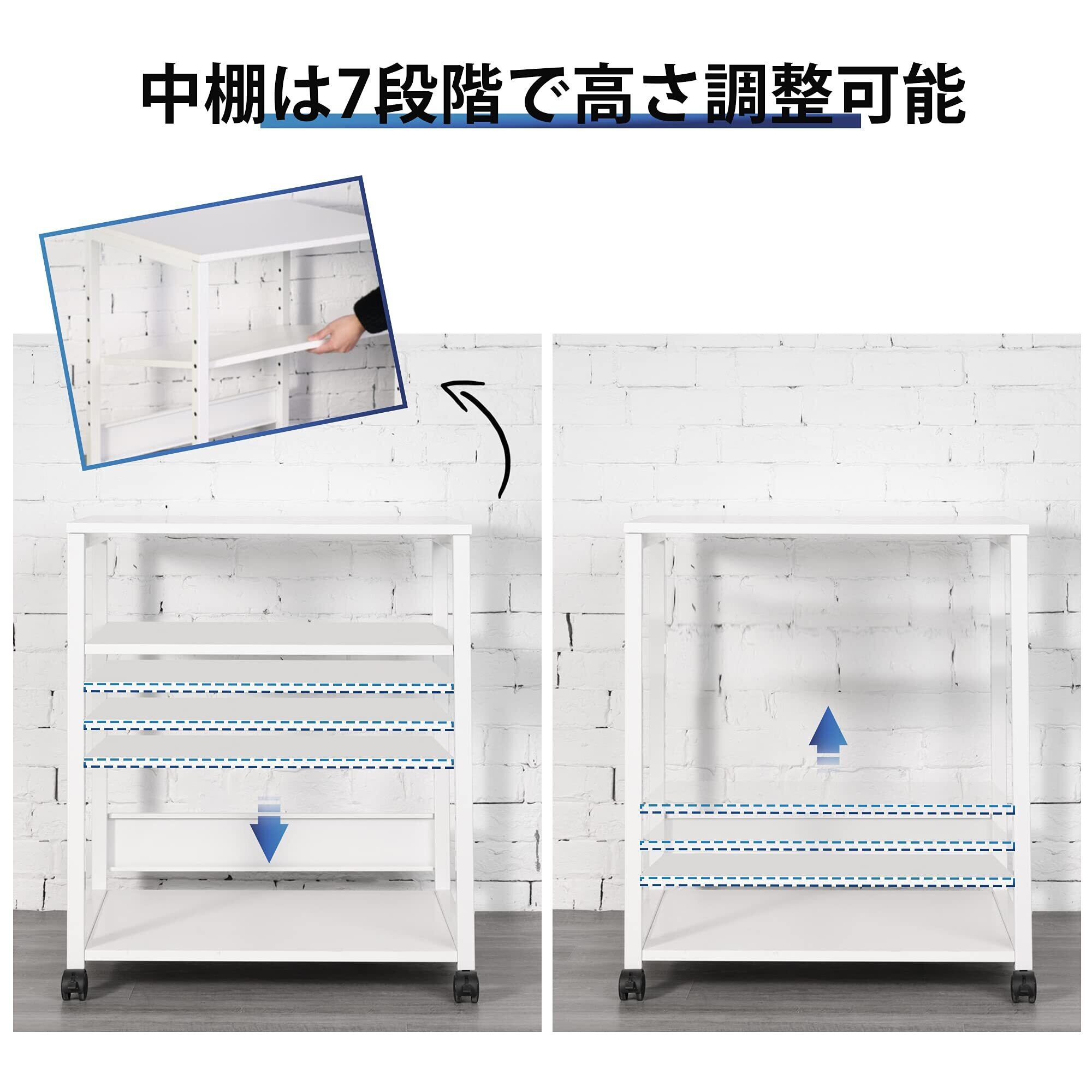 【7段階で調整できる中棚】プリンタ類はもちろん、収納物に合わせて中棚が柔軟にカスタマイズでき、周辺機器や消耗品も一緒に収納できます。