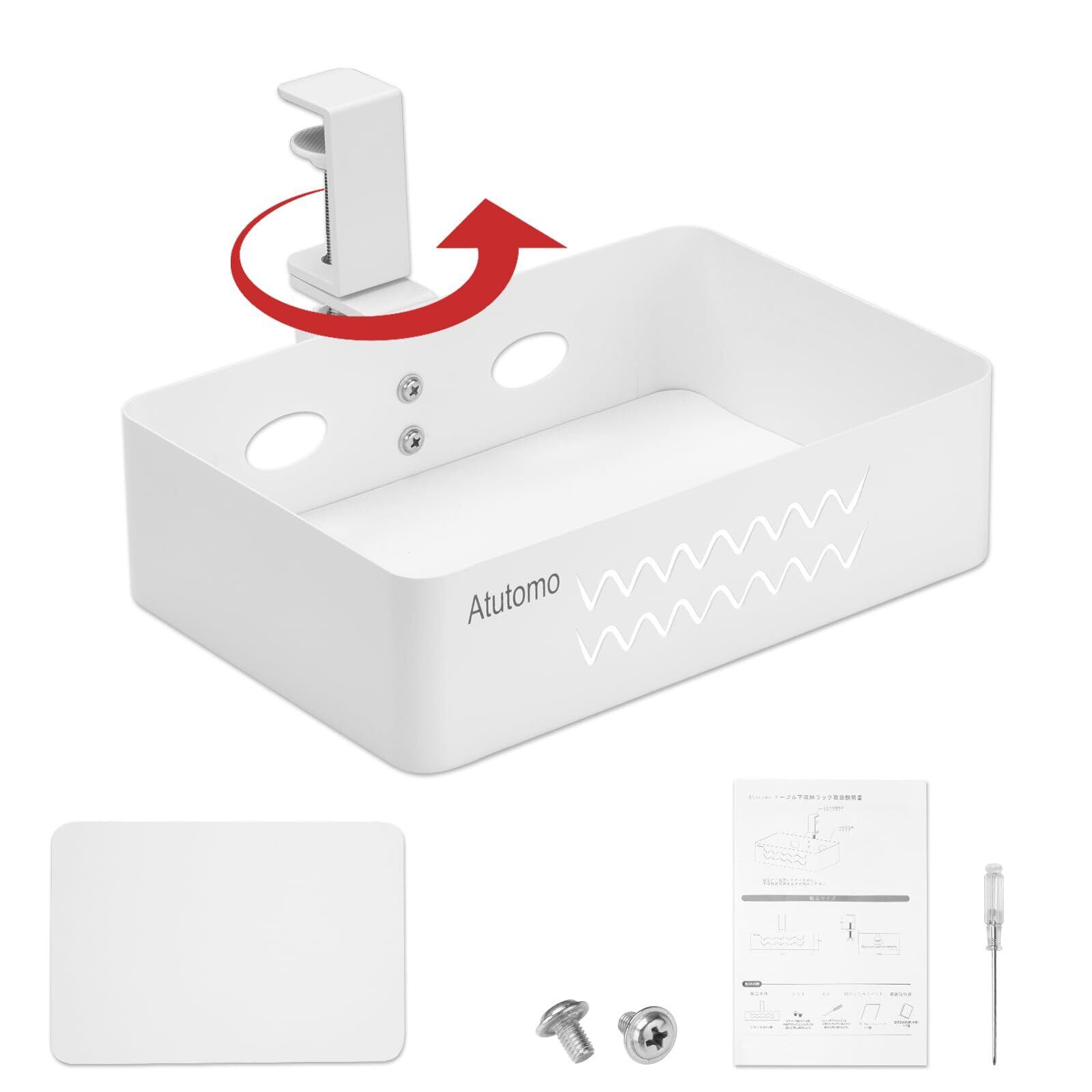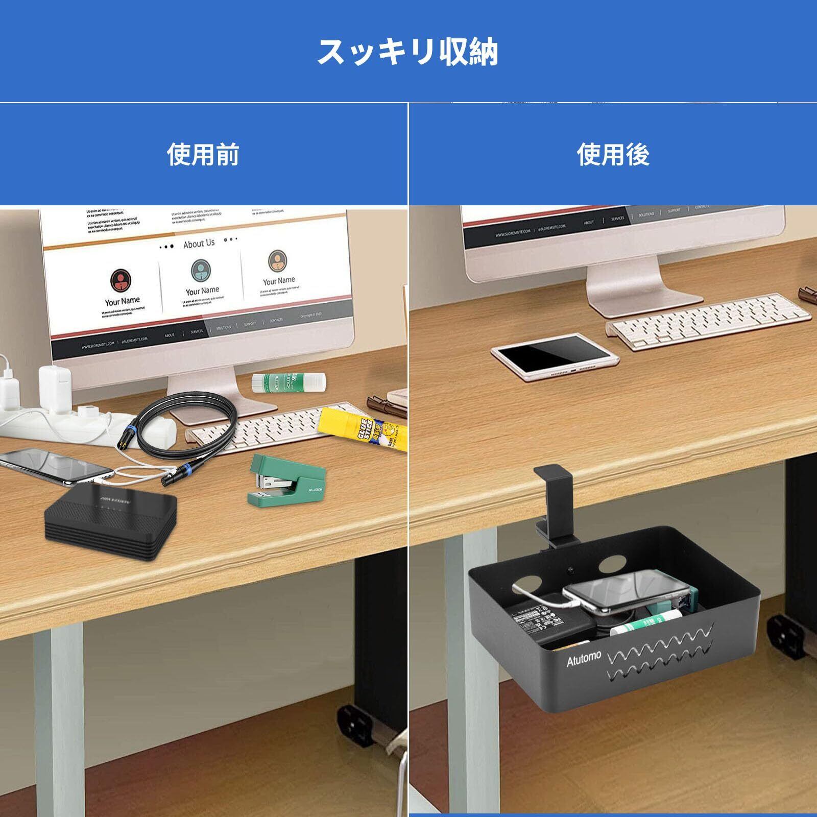 優しいデザイン設計:1.テーブル下収納ラックは後ろに2つケーブル管理する穴があり、この穴を通じて携帯電話に充電ができます。2.収納ボックスにPUクッションパッドも付き、小物を傷防止です。3.固定クリップの内側に高品質の緩衝材を追加しました。安心してご利用ください!