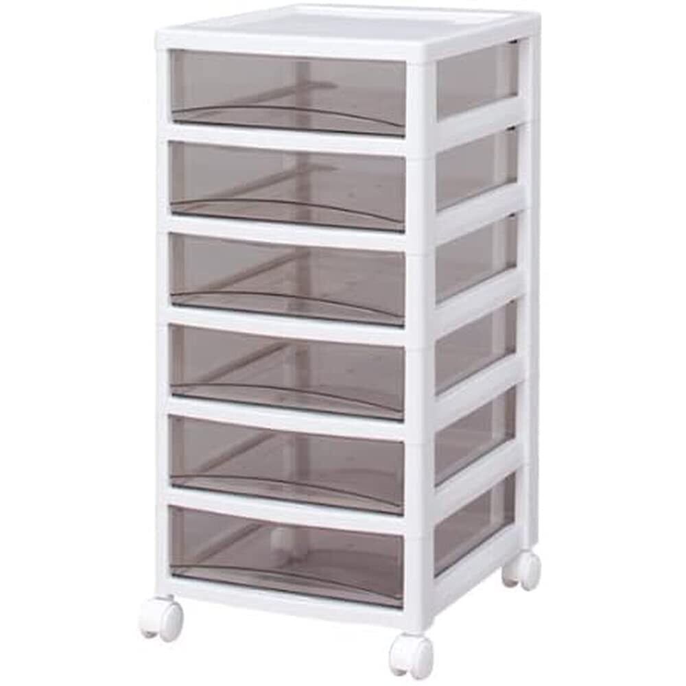 ●引き出しの材質にスチロールを採用しているため透明度が高く、中身が確認しやすいクリアタイプのチェストです。●引き出しは飛び出しにくい、簡易ロック構造です。●移動に便利なキャスター付です