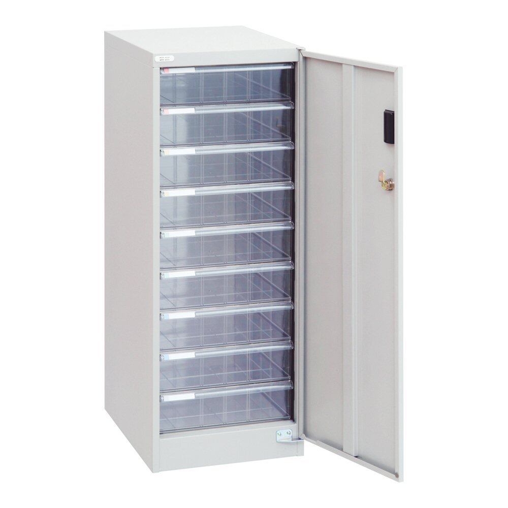 <b>材質:</b> 本体/スチール・粉体焼付塗装、引出し/透明スチロール樹脂