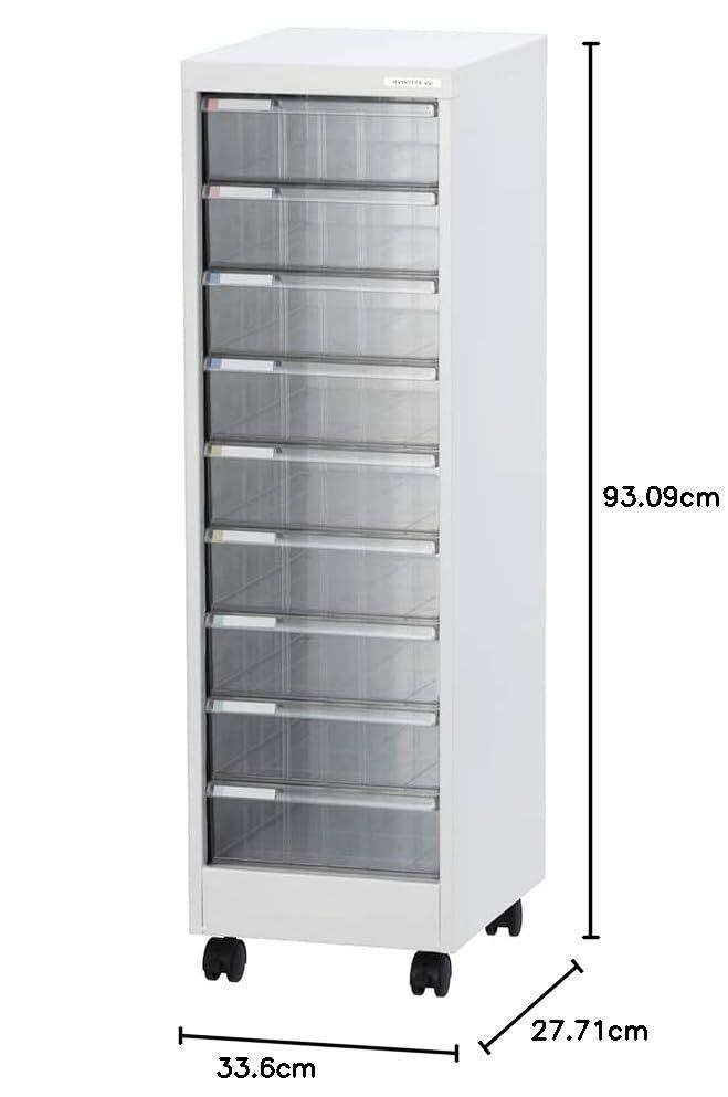 材質:本体/スチール 粉体焼付塗装、引出し/透明スチロール樹脂、引出し段板/ポリプロピレン、キャスター/ナイロン