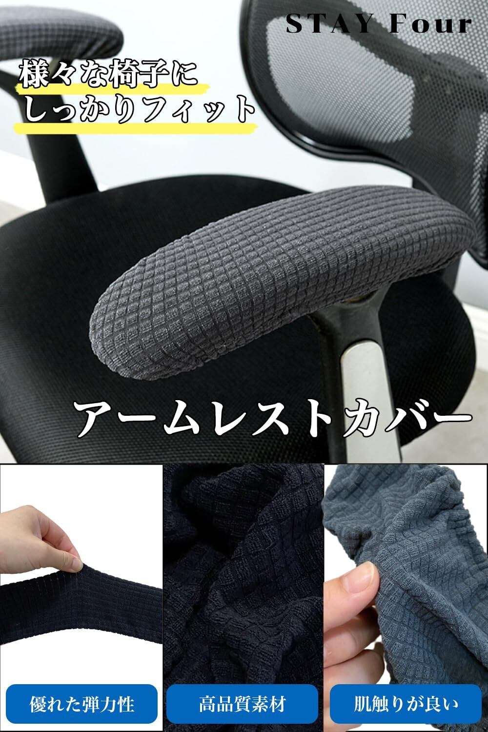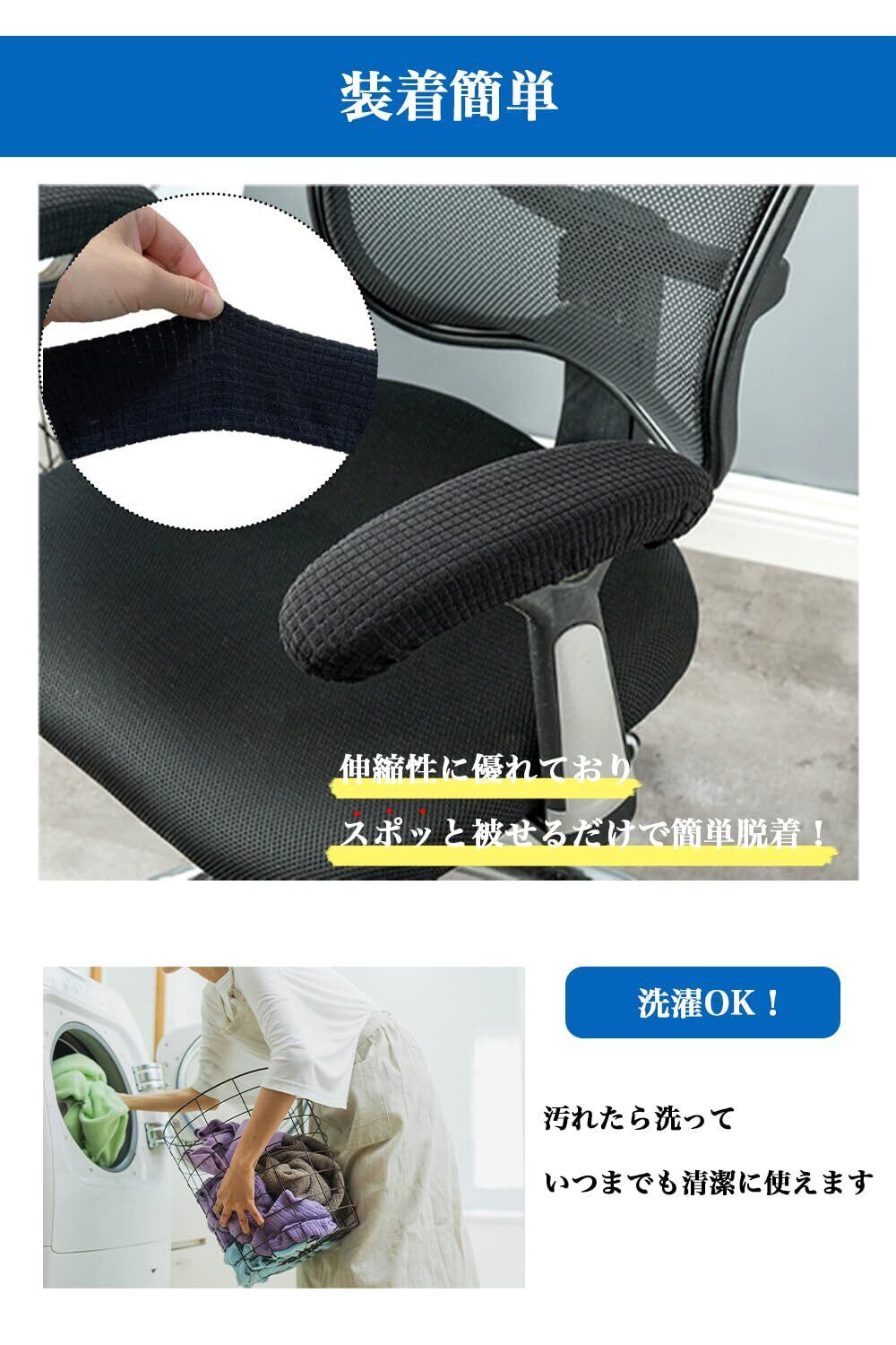 【 快適な使い心地 】 クリエーターやプログラマー、ゲーマーなど長時間PC作業をされるお仕事の方は、腕や肘に負担が多くかかりやすいです。そのため、椅子にアームレストがついており休めることができます。ですが長く使用していると劣化してきてしまいます。そんな時におすすめのアイテムがアームレストカバーです。カバーをすることで、見た目もスッキリし、使い心地も快適です肘置きをしっかり保護してくれるため、長くご愛用していただけます