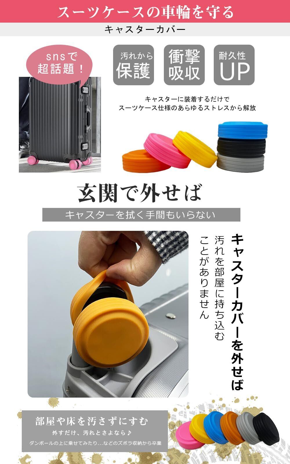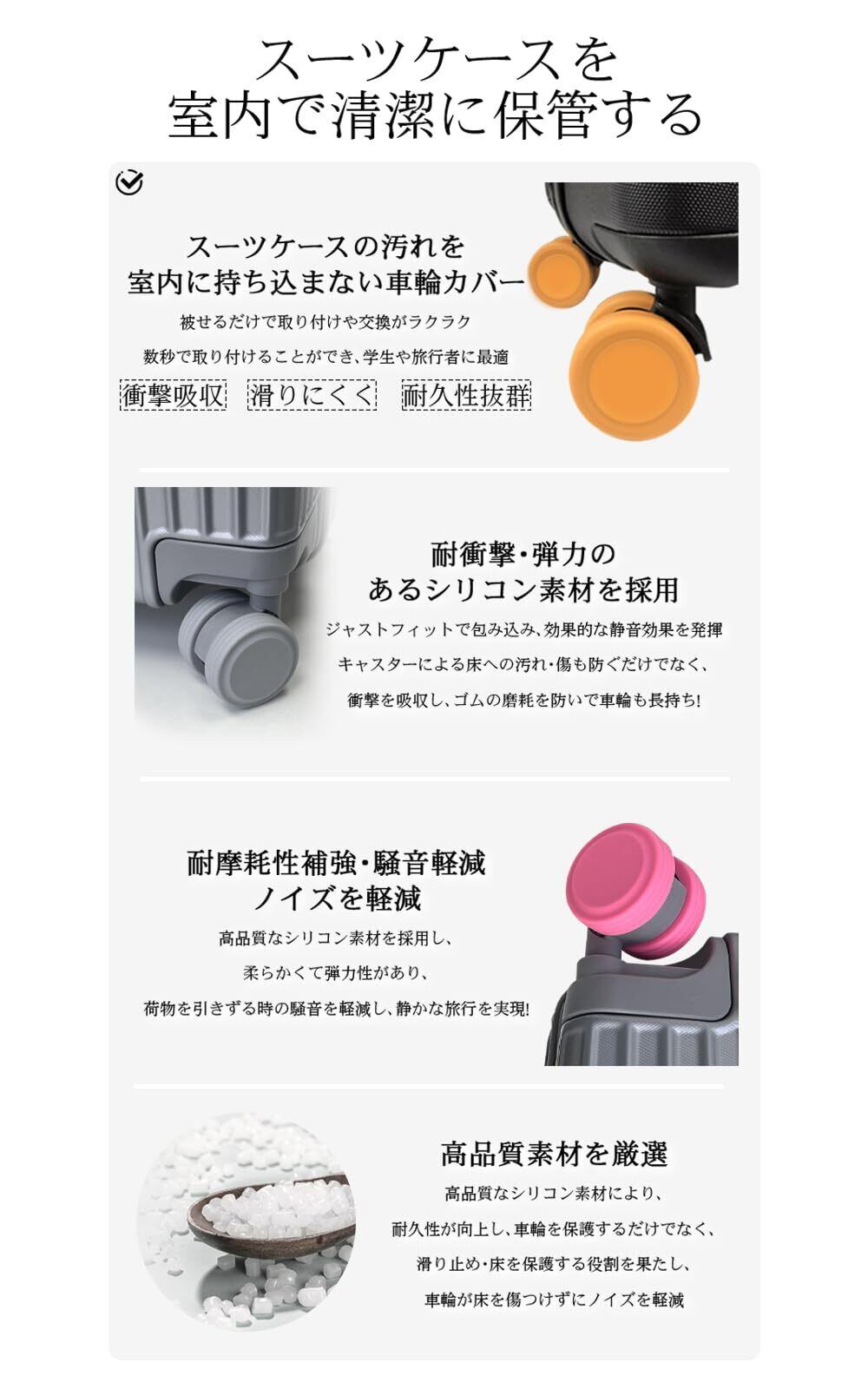 【取り付けが簡単&水洗い可能】 被せるだけで取り付けや交換がらくらく数秒で取り付けることできます.直径4.5-5.5cmのホイールにも適用し、幅広い互換性を持ちます。防水のシリコン製で、洗った後すぐきれいになって何度でも繰り返し使えますスーツケースを床のキズ防止にも役たつ、室内で清潔に保管します。