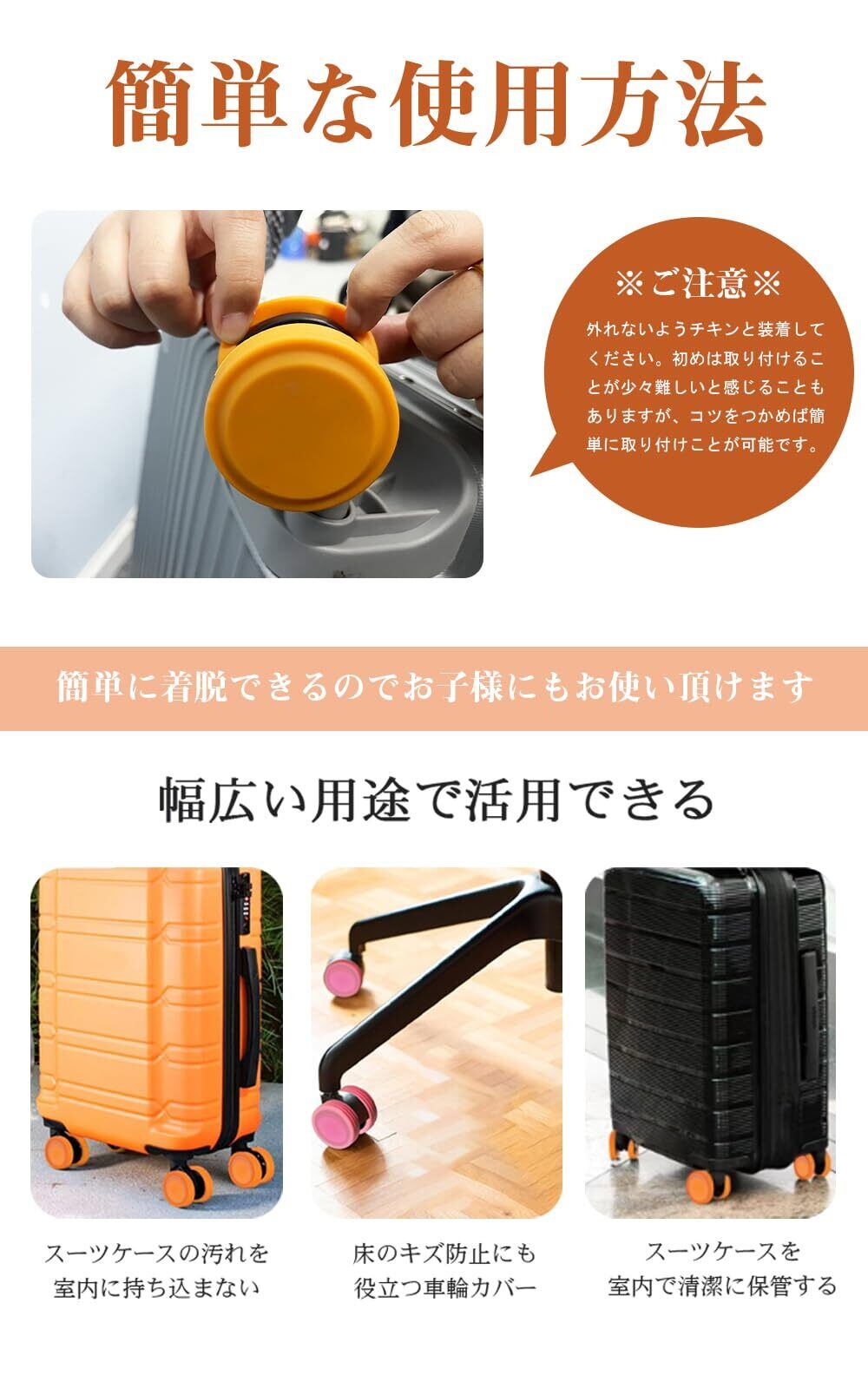 【パッケージ内容 】8個同色のスーツケースキャスターカバー。適用のキャスターの直径範囲は4.5-5.5センチでございます。(もし、何か商品の問題がございましたら、お気軽に弊店へご連絡ください。)