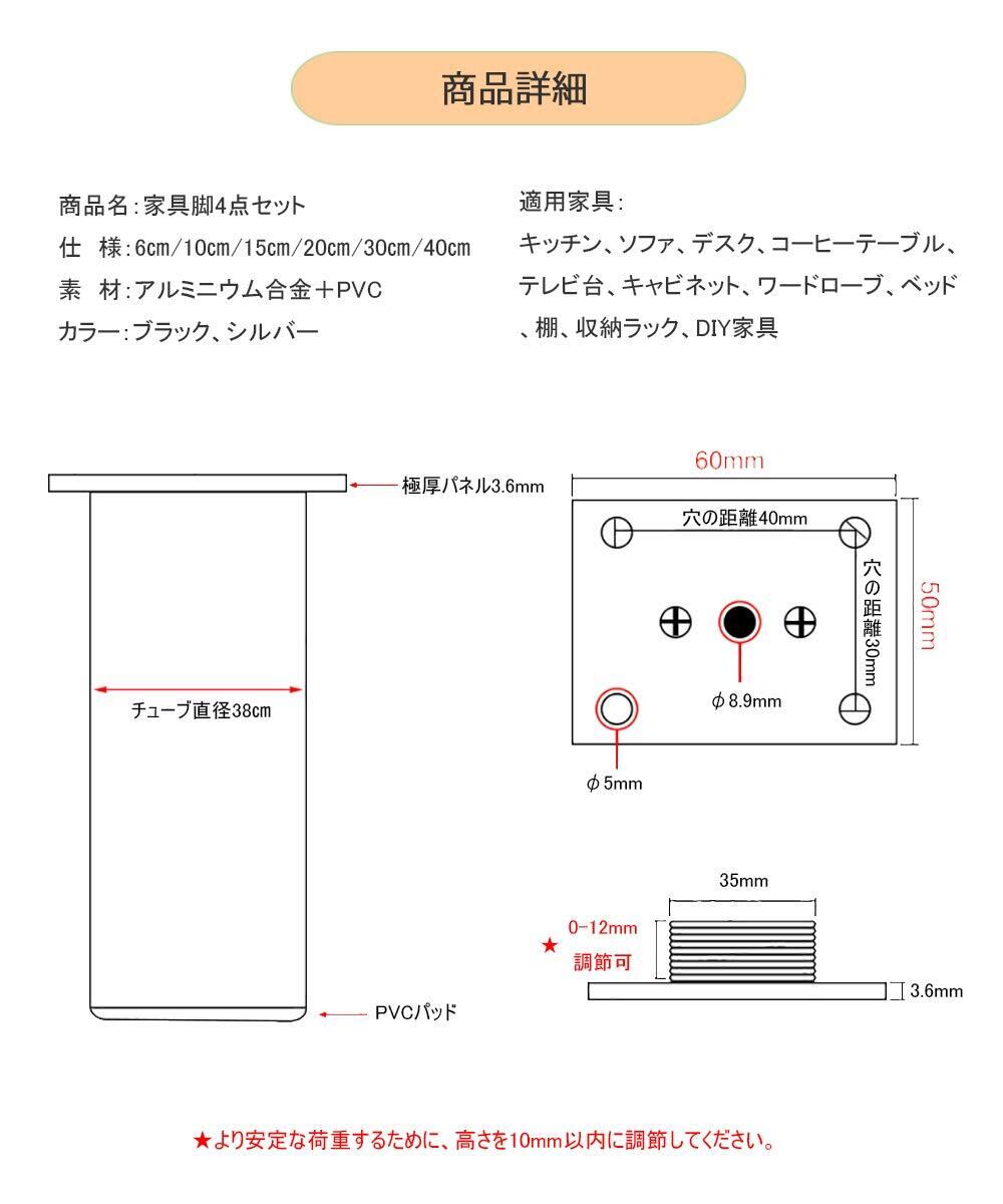 ③耐荷重パネルが極厚の3.6mmになり、チューブ壁の厚さは1.7mm、一つの家具脚の耐荷重は100kgまで ④PVC滑り止めパッドが付き、床を傷つけない、騒音を減らします。