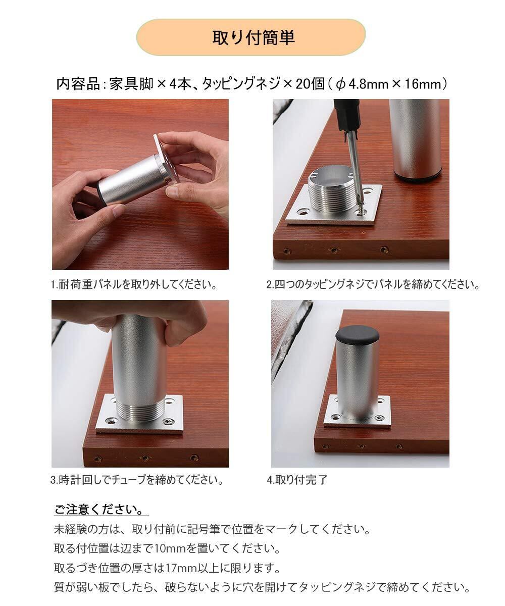 「内容品」:家具脚×4、滑り止めパッド×4、タッピングネジ×16(4.8×16mm) 「取り付簡単」:ネジのみで簡単かつ便利に取り付けます。