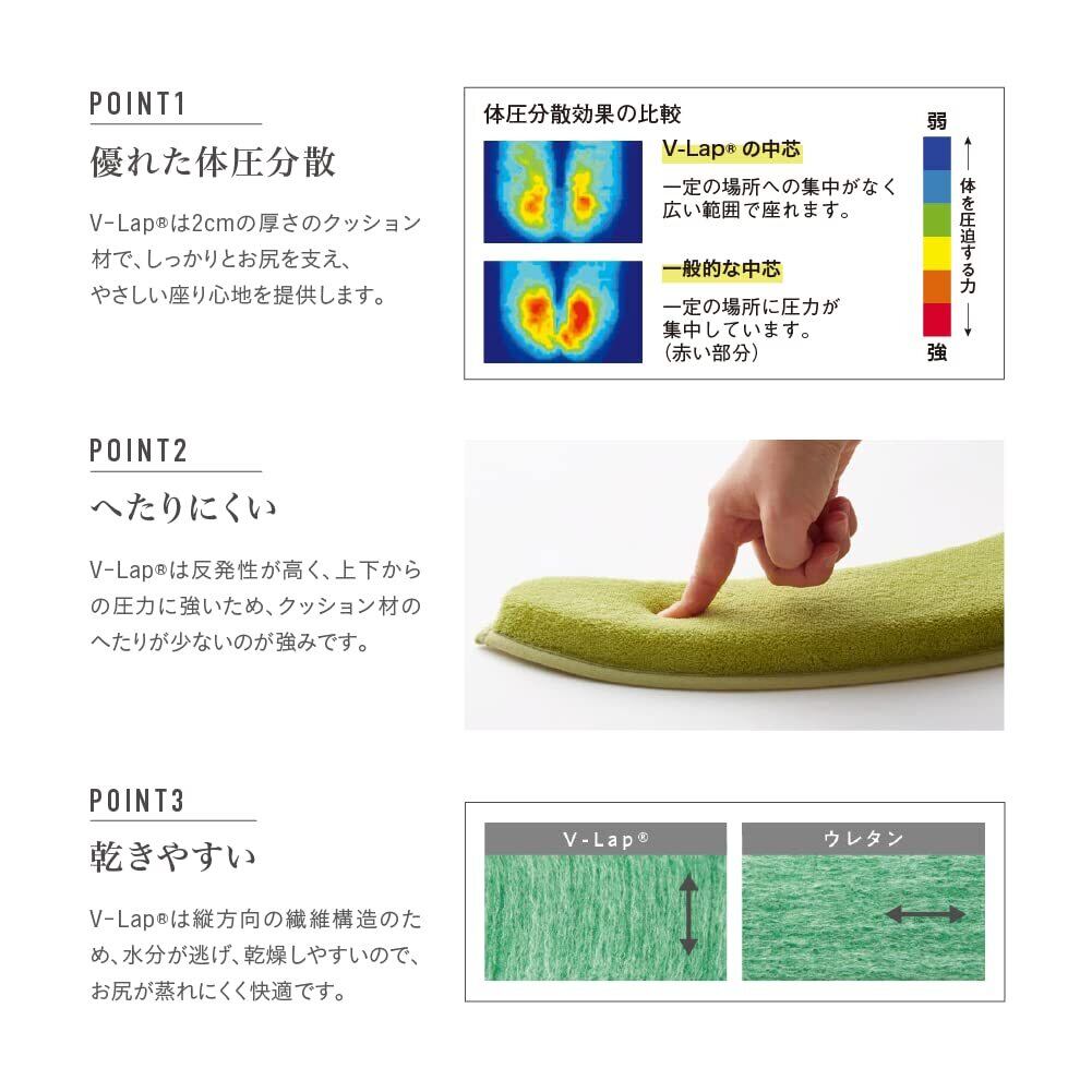 【優れたクッション材】クッション材にはテイジンの特殊クッション材 V-Lapを使用。優れた体圧分散でしっかりお尻を支え、やさしい座り心地。上下の圧力に強いので、へたりにくい。水分が逃げやすく、乾燥しやすい。お尻も蒸れにくく快適。