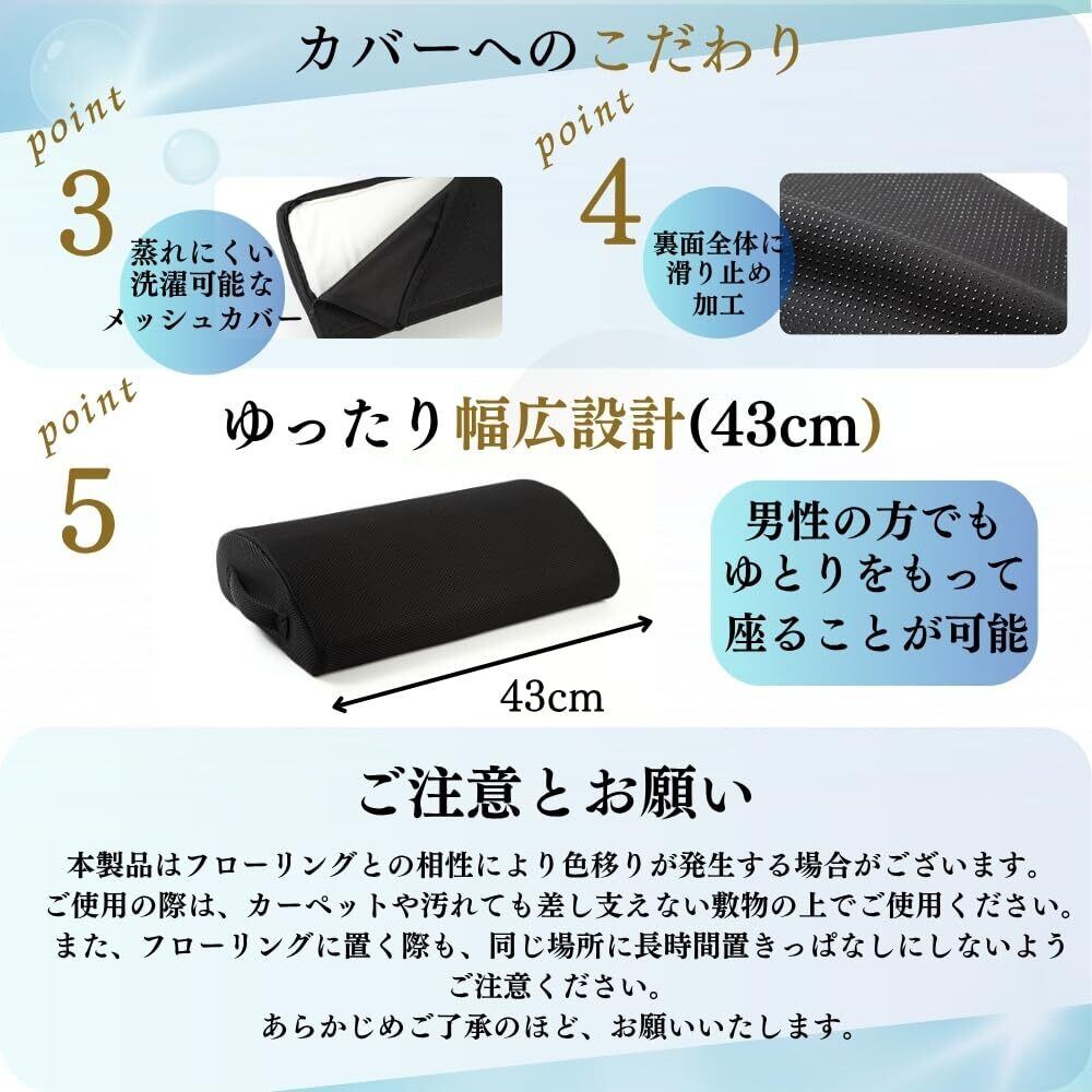 【商品仕様】縦幅255㎜×横幅430㎜×高さ103㎜ 重さ355gの軽量設計 密度30dの高反発クッションを使用 洗濯可能なメッシュカバーで蒸れにくく、いつまでも清潔にお使いいただけます。裏面全体には滑り止め加工で、絨毯、フローリング問わず安全にお使い頂けます。