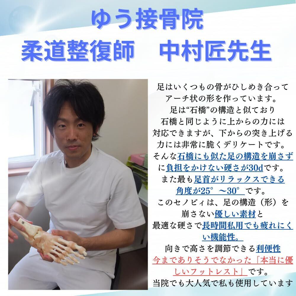 【整体師の先生が監修】制作にあたり、骨格のプロである柔道整復士の資格を持つ整体師の先生のアドバイスを頂き、高さ、硬さ、角度の面において、長時間使用しても疲れにくいフットレストを制作しました。