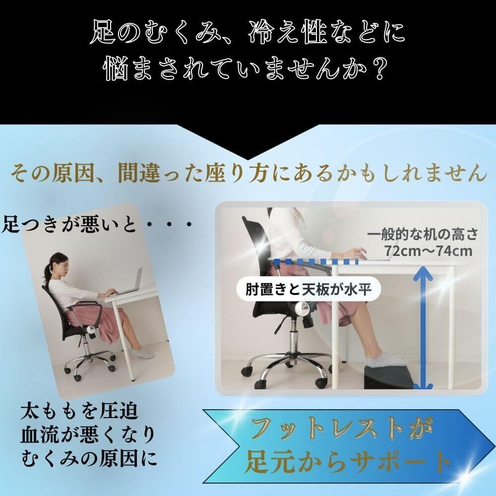 【正しい座り方をサポート】現在市販されているデスクの高さは70㎝〜72㎝。デスクの高さに椅子の肘置きの高さを合せる事が、正しい座り方と言われています。高さに椅子を合せると、小柄な方は、足つきが悪く、ふとももの血流を圧迫しむくみや冷え性の原因になります。そこで開発されたのが、このフットレストです。