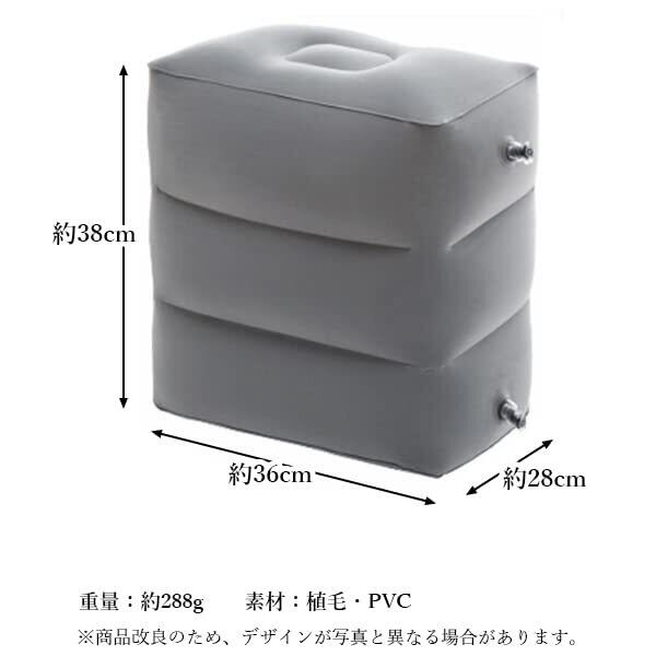 ・空気を入れるだけで簡単に設置できるフットレストです。 ・空気入れが2か所あるので高さを3段階調節可能です。 ・飛行機、新幹線、長距離ドライブなど様々なシーンで活躍します。 ・ソファーから足を伸ばしたいときや、デスクワークで足を休めたいときなどにおすすめです。 ・使用しないときは折りたたんでコンパクトにすることができます。 【商品仕様】 カラー ダークグレー 素材 植毛PVC