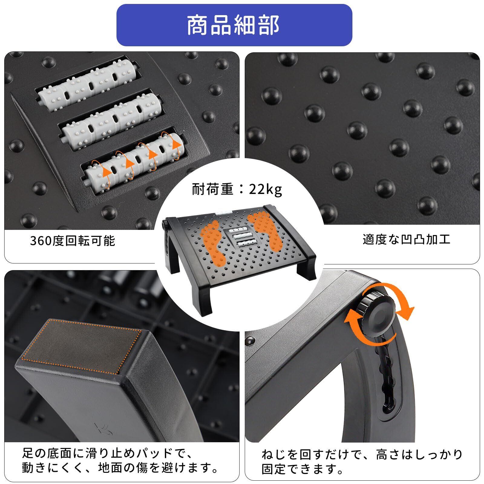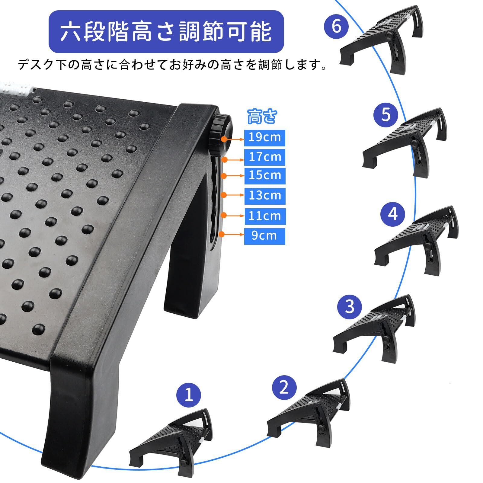 ✨【高さ6段階調節可能なデスク下フットレスト】フットレストの両側に操作するのに非常に便利な調節ネジが備わって、高さは六段階(9cm・11cm・ 13cm・15cm・17cm・19cm)調整可能です。使用者の身長、椅子やオフィスデスクの高さに応じてうまく調整できますので、より座り心地がよいです。表面には適度な凹凸加工を施しているので、滑りにくくなっており、靴を履いたまま使えます。