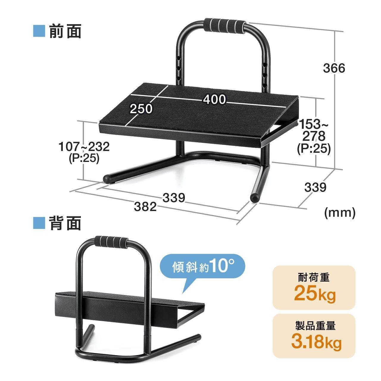 サンワダイレクト フットレスト デスク下 6段階高さ調整 スチール製 足置き台 1個 100-FR010