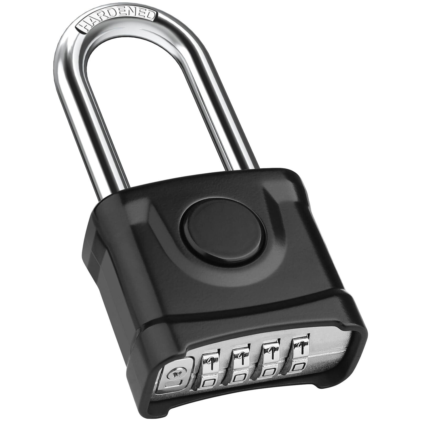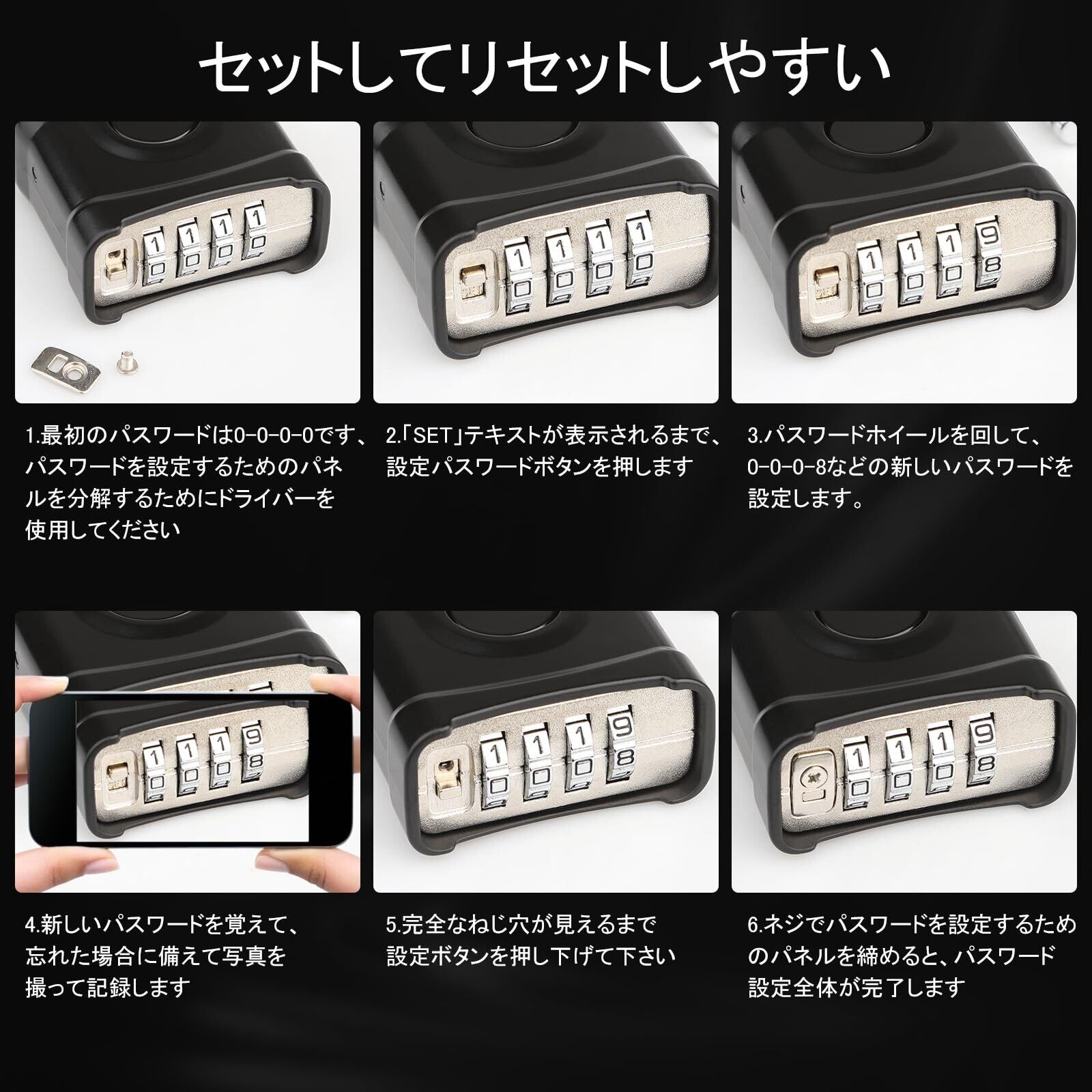 【ワンクリックアンロックデザイン】南京錠 ダイヤル について ロックのオリジナルパスワードは0-0-0-0です。パスワードを調整した後、真ん中のボタンを押すとダイヤル錠が開きます。注:パスワードを変更する際、新しいパスワードを記録するために写真を撮ってください