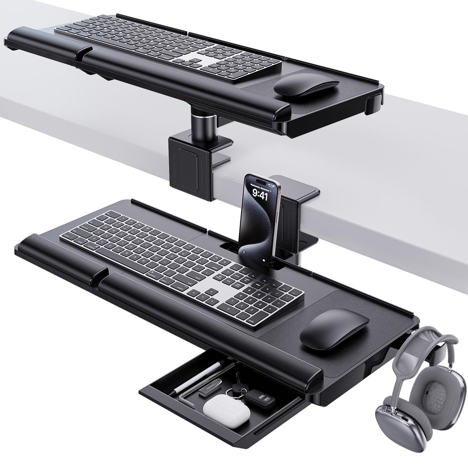 キーボードスタンドはキーボードとマウスを引き上げることで、貴重なデスクスペースを解放します。使わない時はトレイをデスク下にスライドさせ、デスクをすっきりと保ち、整理整頓が簡単です。家庭、オフィス、ゲームスペースなど、あらゆる環境に簡単に溶け込み、快適さと利便性を提供します。