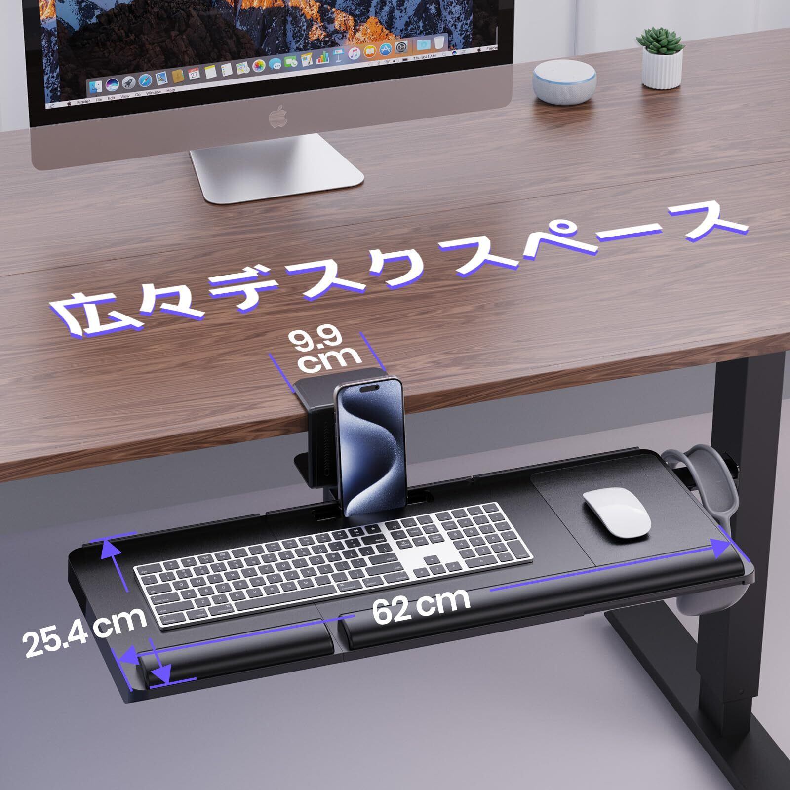 工匠藤井 キーボードトレイ 机の上 机の下 両用 360度回転 クランプ式 後付け 人間工学 角度調節可能 テーブル拡張 収納性抜群 取付簡単フルーキーボード対応 ヘッドホンフック キーボードスライダー マウスパッド 幅62*25.4㎝ ブラック