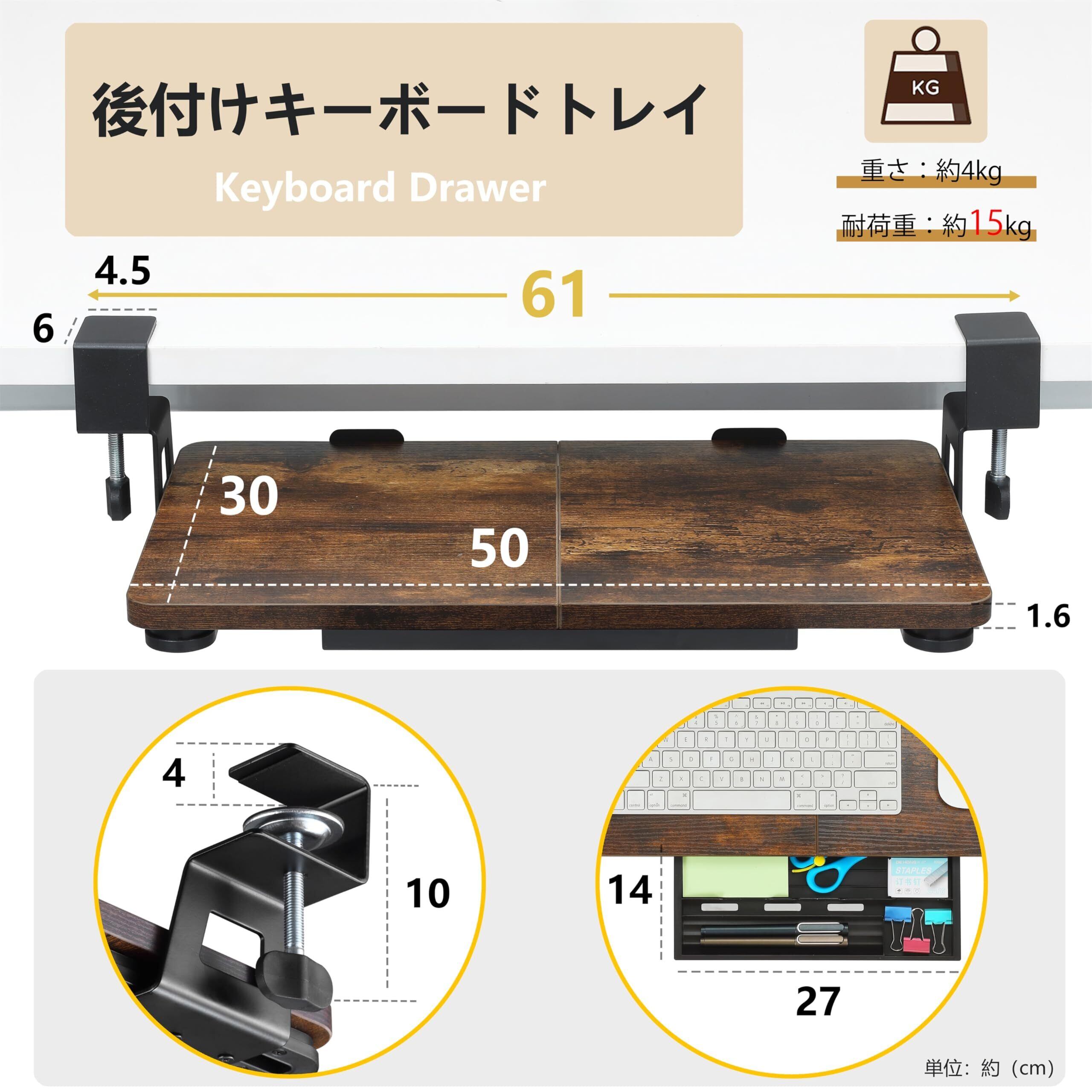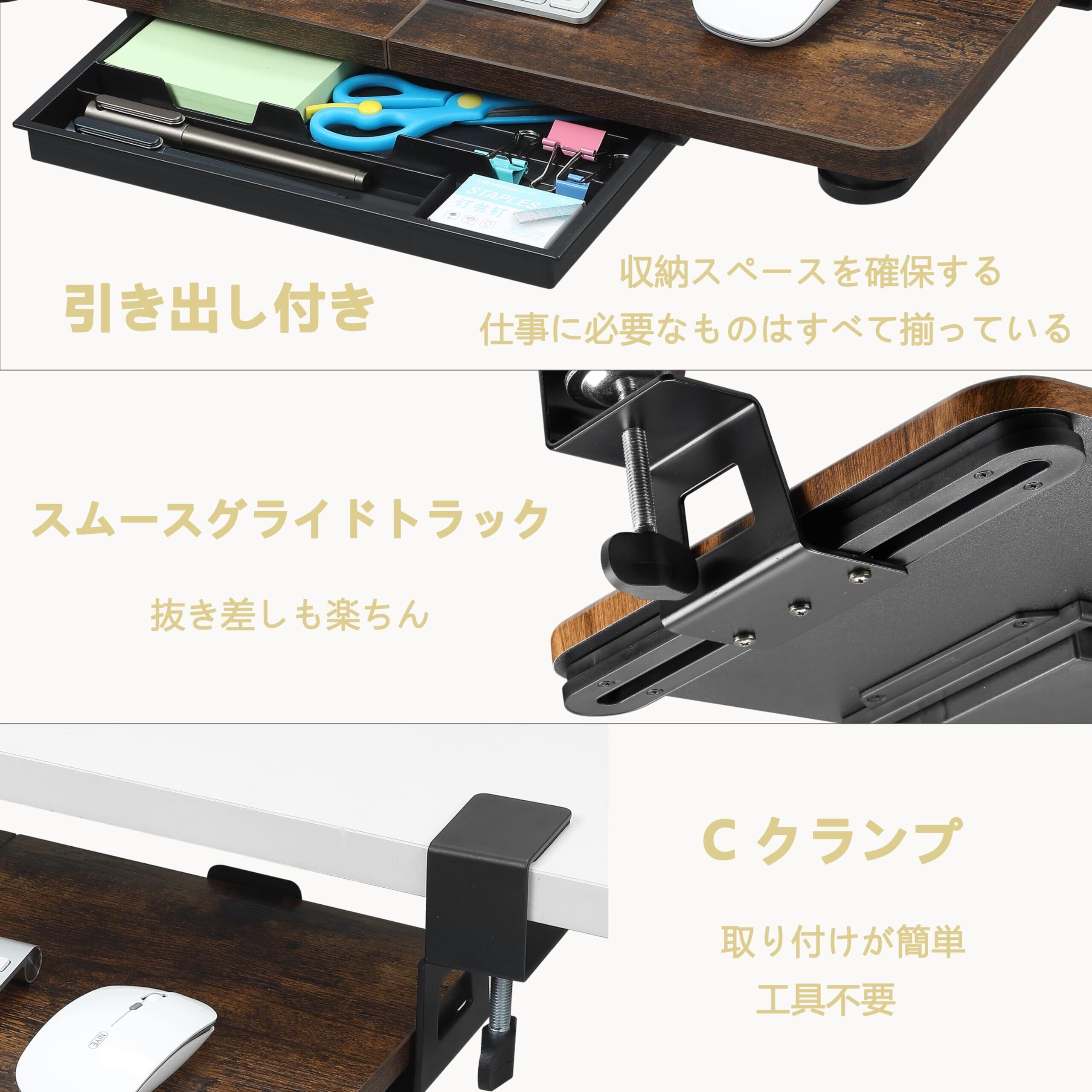ETHU キーボードトレイ キーボードスライダー 天板2枚接ぎ 500*300mm 引き出し付き 文具収納 後付け クランク式 ペンケース付き スマホホルダー マウス収納 木目調