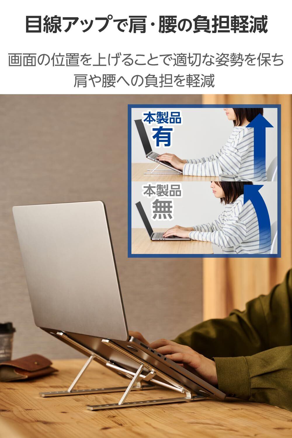 ノートパソコンの高さを変えることで目線を上げることができ、作業中の姿勢を改善します。