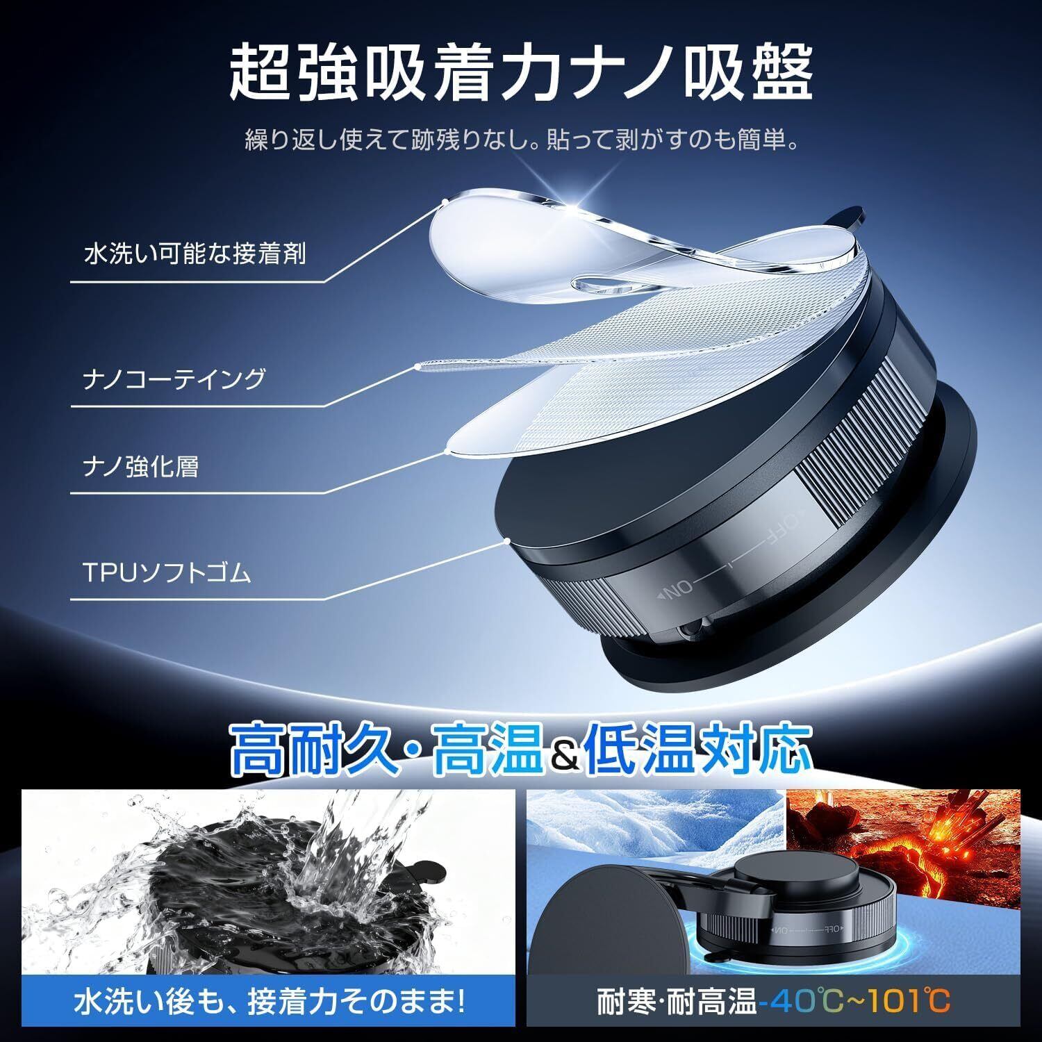 【亜鉛合金の高級デザイン|水洗いで吸着力が復活】上質なマット加工を施した亜鉛合金フレームを採用。車内のインテリアを格上げするラグジュアリーな質感でありながら、指紋や汚れが目立ちにくい設計です。ナノゲル吸盤は、粘着力が弱まっても水洗いするだけで新品のような吸着力が復活。耐久性に優れ、経済的に長く愛用できる「一生モノ」のカー用品です。