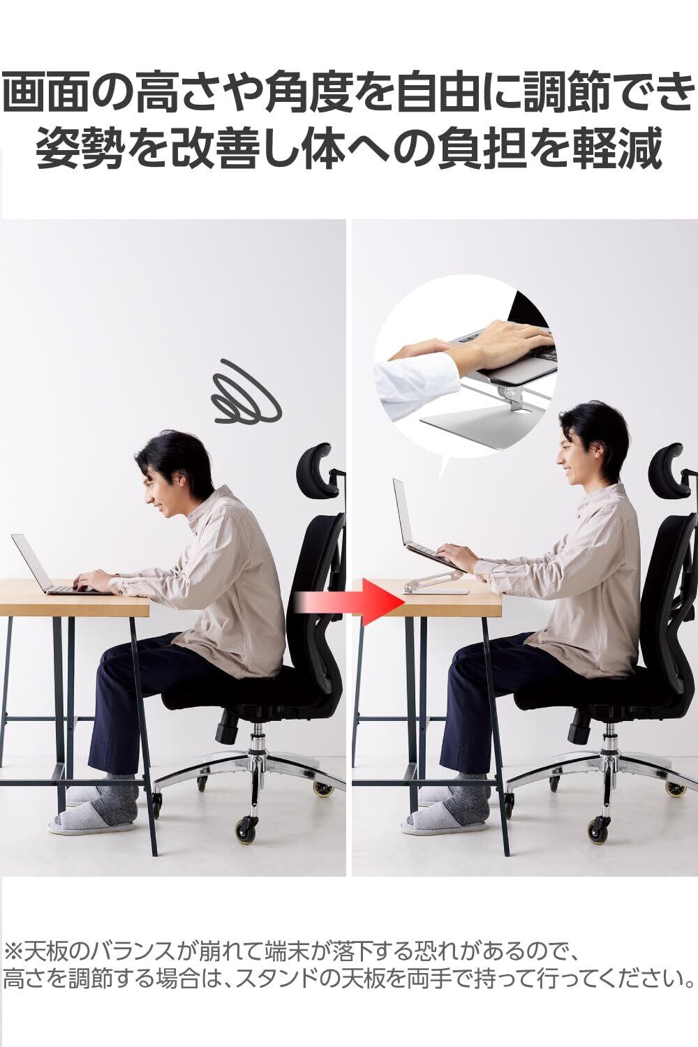 ■※天板のバランスが崩れて端末が落下する恐れがあるので、高さを調節する場合は、スタンドの天板を両手で持って行ってください。