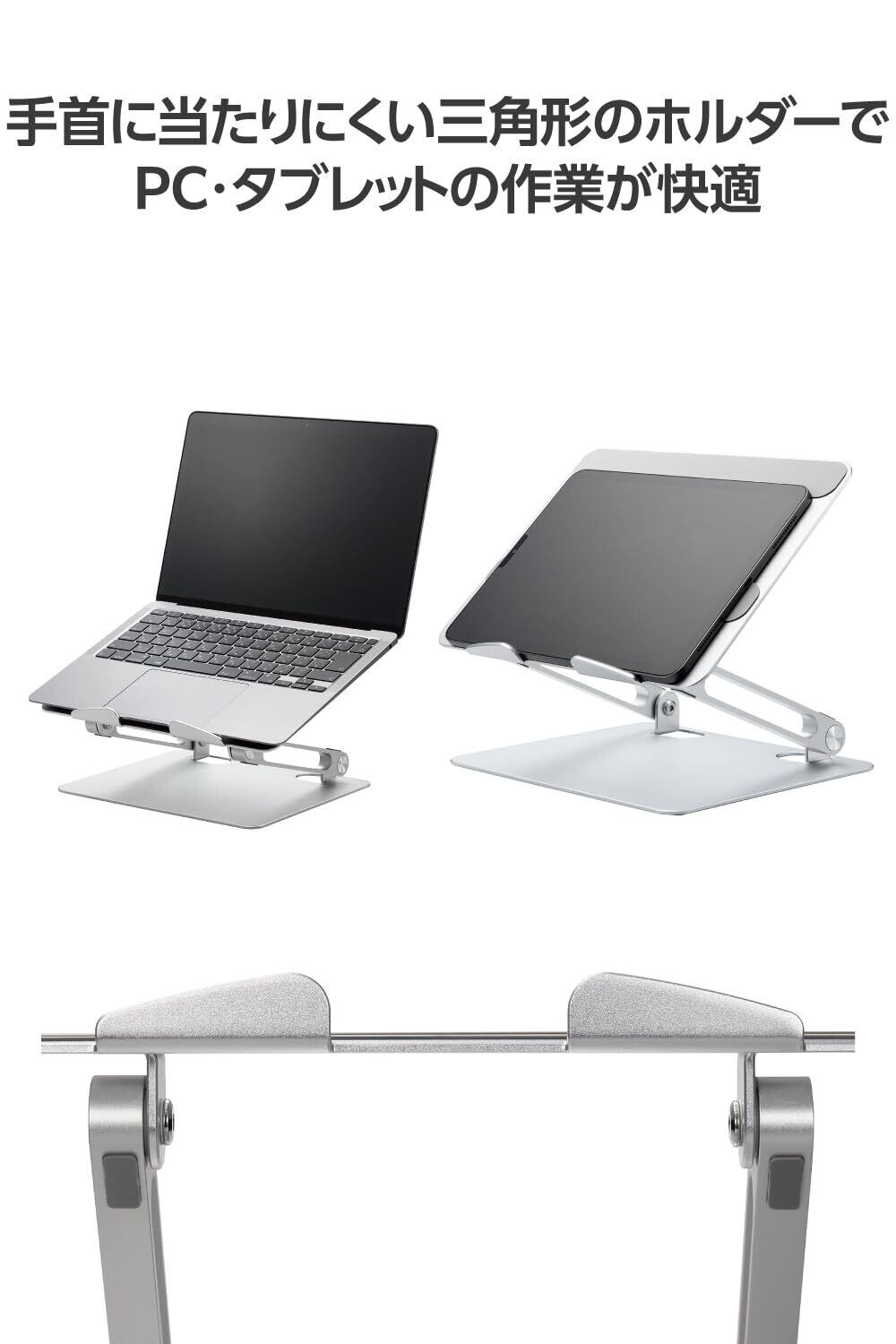 作業時にホルダーが手首に当たりにくい、スマートフォンやタブレット、ノートパソコン用の折りたたみ式スタンドです。