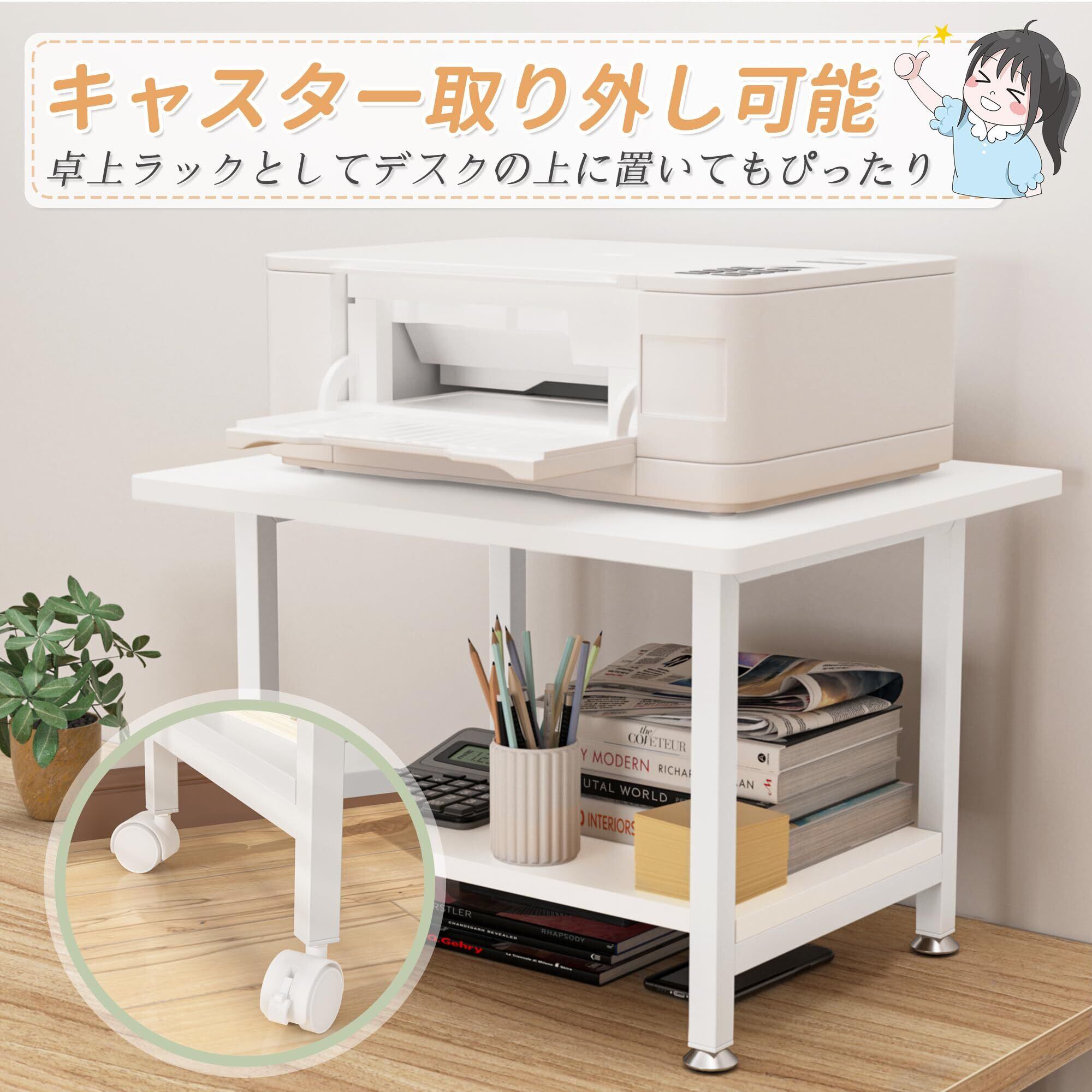 【卓上ラックとして使える】このプリンター ラックはキャスターとアジャスターが各一式が付いており、必要に応じて、アジャスターを組立すると、机上ラックとして机上に設置して使用できます。