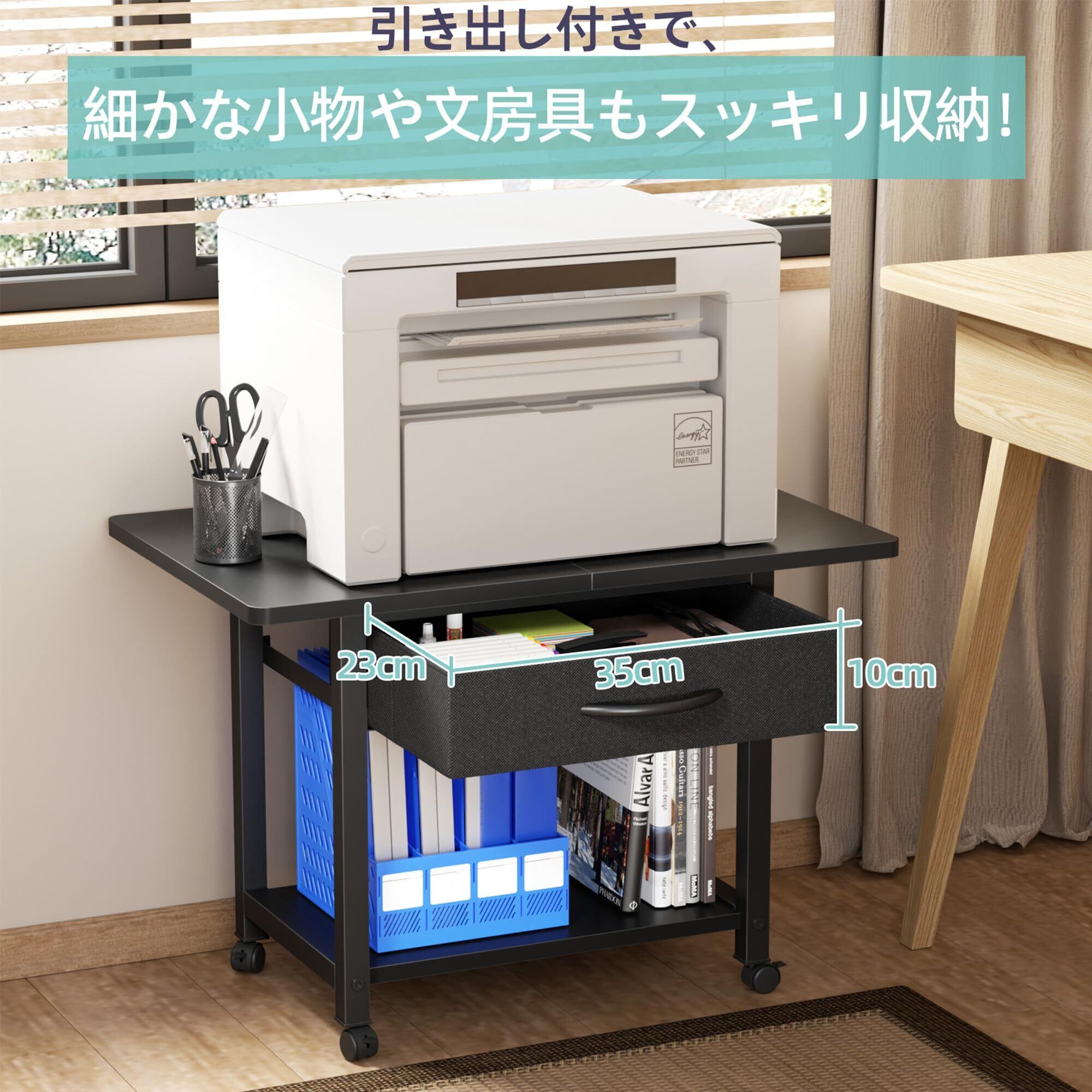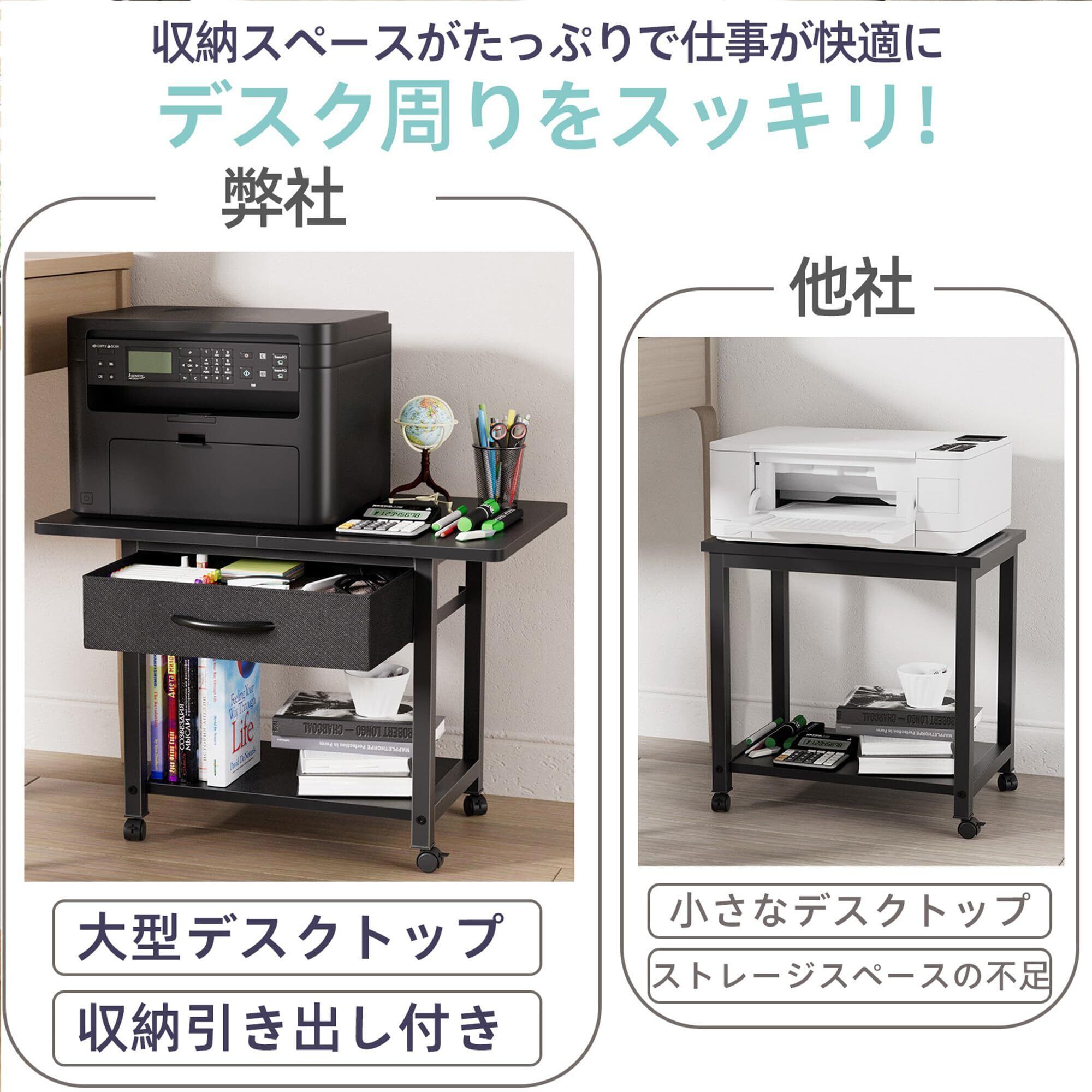 【大容量の収納スペース】プリンターラックは2段収納です。上段にはプリンターを置く広々としたスペースがあり、下段には紙やインク、書類、文房具などを収納できるオープン棚と引き出しが付いています。 大きな収納スペースは、収納ニーズに完璧に応えます。