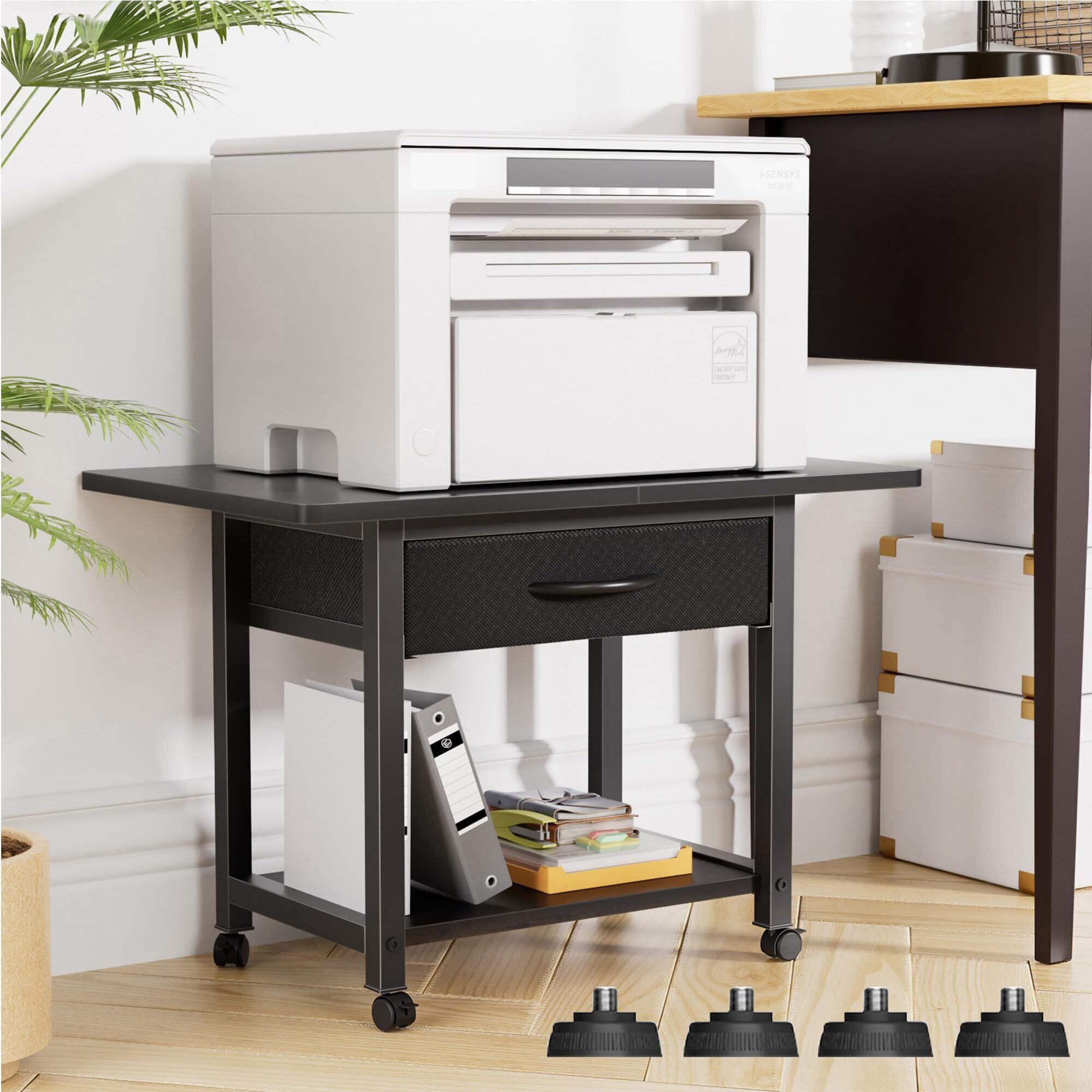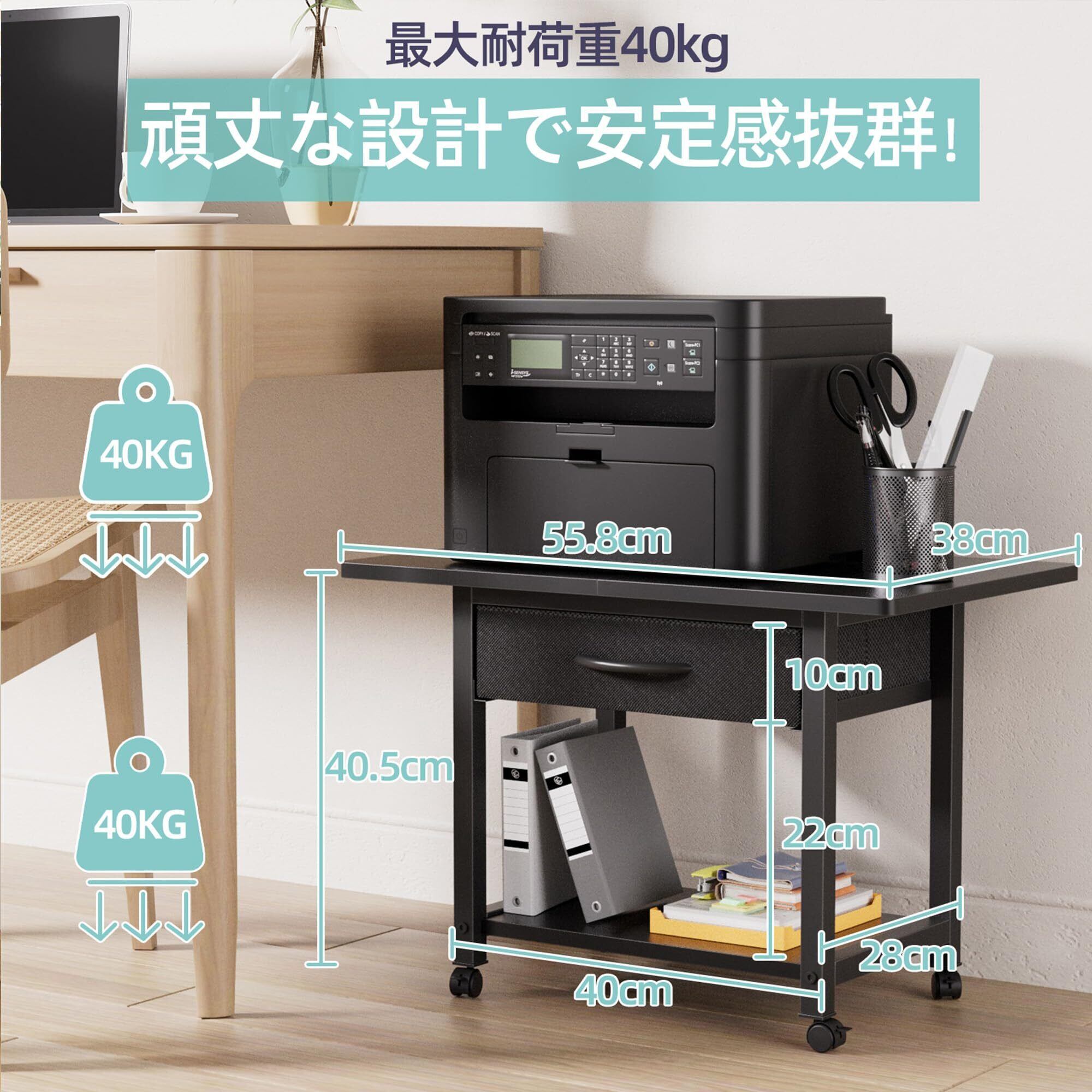 プリンター台 キャスター付き プリンターラック 引き出し付き デスク下 収納 2段 コピー機置き台 耐荷重40kg 幅56cm×奥行38cm×高さ40cm オフィス ホーム 360度回転 頑丈 組立簡単 (ブラック)