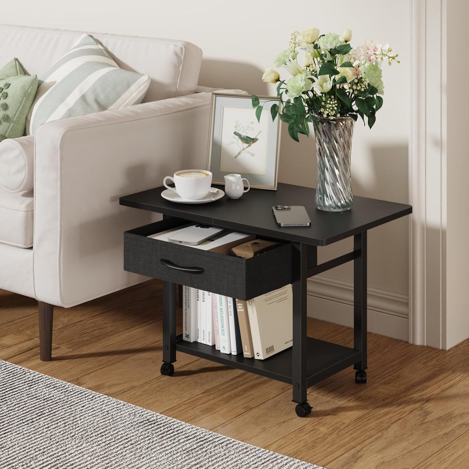 【在庫処分】プリンター台 キャスター付き プリンターラック 引き出し付き デスク下 収納 2段 コピー機置き台 耐荷重40kg 幅56cm×奥行38cm×高さ40cm オフィス ホーム 360度回転 頑丈 組立簡単 (ブラック)