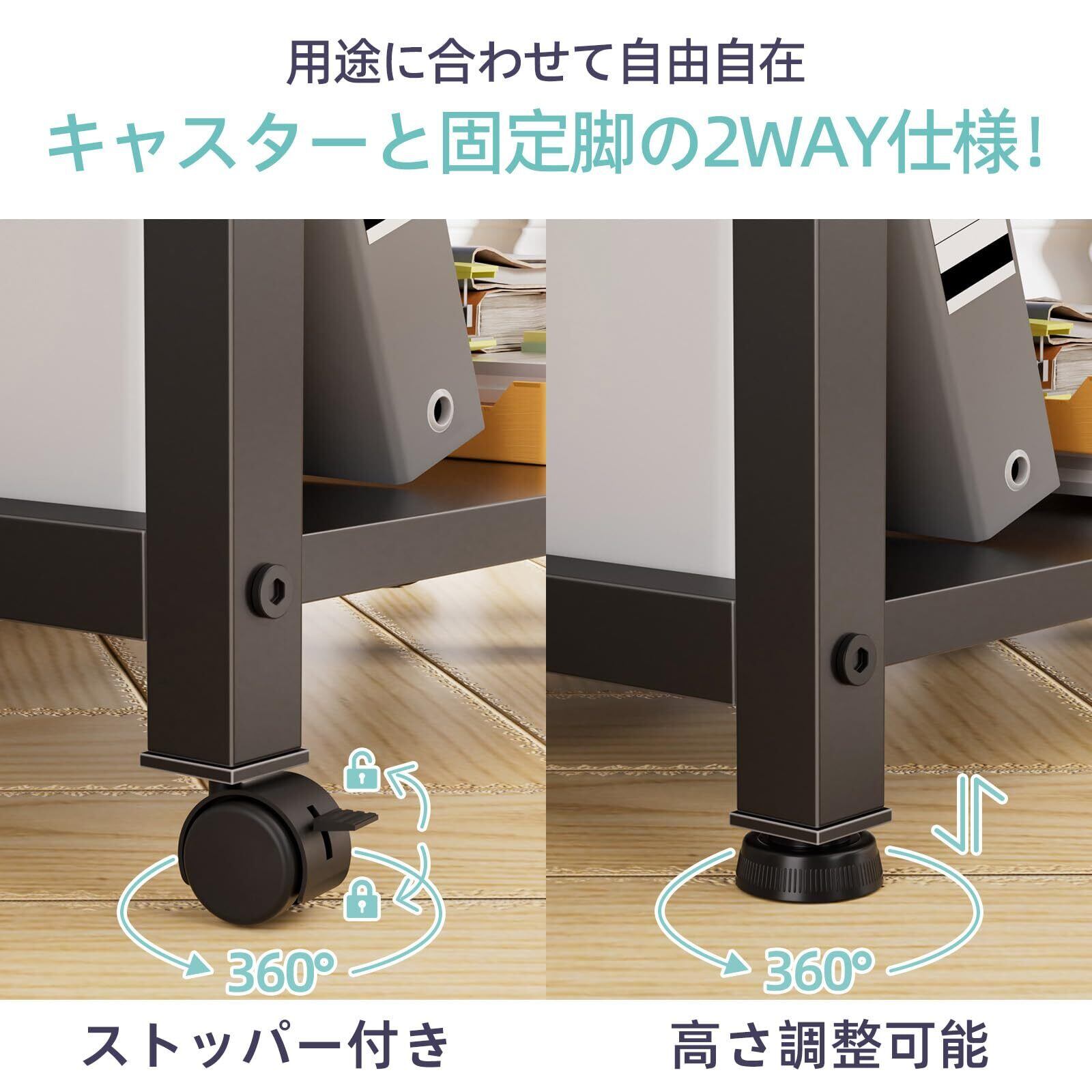 【コンパクト&移動便利】高さわずか40cmのプリンタースタンドは、デスクの下に置くのに最適で、場所を取りません。 360度回転する4輪キャスター付きで、移動の手間が省け、オフィスや寝室、キッチンなど様々な場所に適しています。さらに、アジャスター脚も付属しており、据え置きとしての使用もOKです。