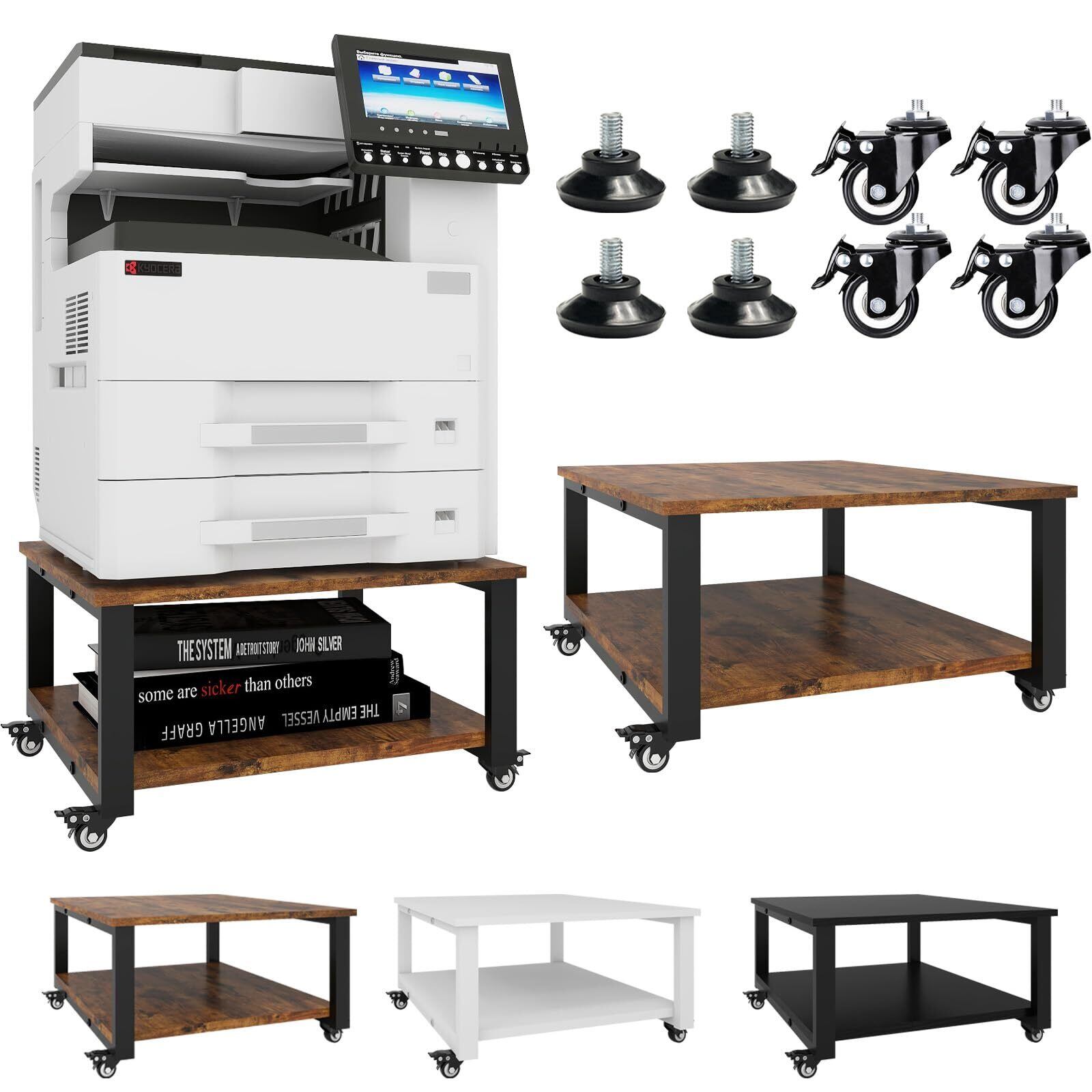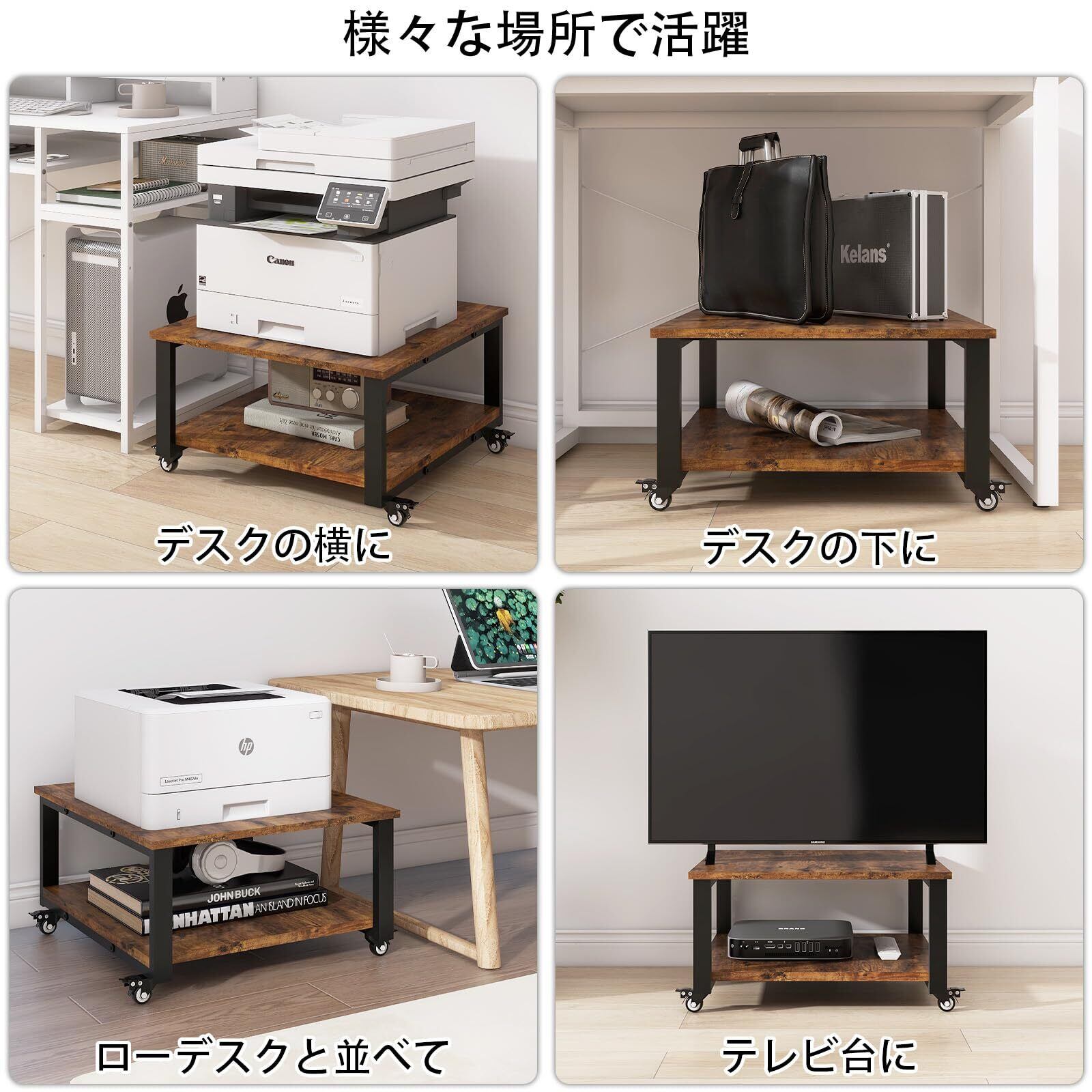 【安定性&耐久性に優れた】プリンター ラックは二重層構造デザインを採用して、天板と底板に一本のベアリングロッド追加したことで、、安定性に優れ、総耐荷重はなんと90kg。プラスチックキャスターの代わりに、ロック付き工業用キャスターを採用して、耐荷重が強く、耐久性に優れた。長期使用可能な製品である。