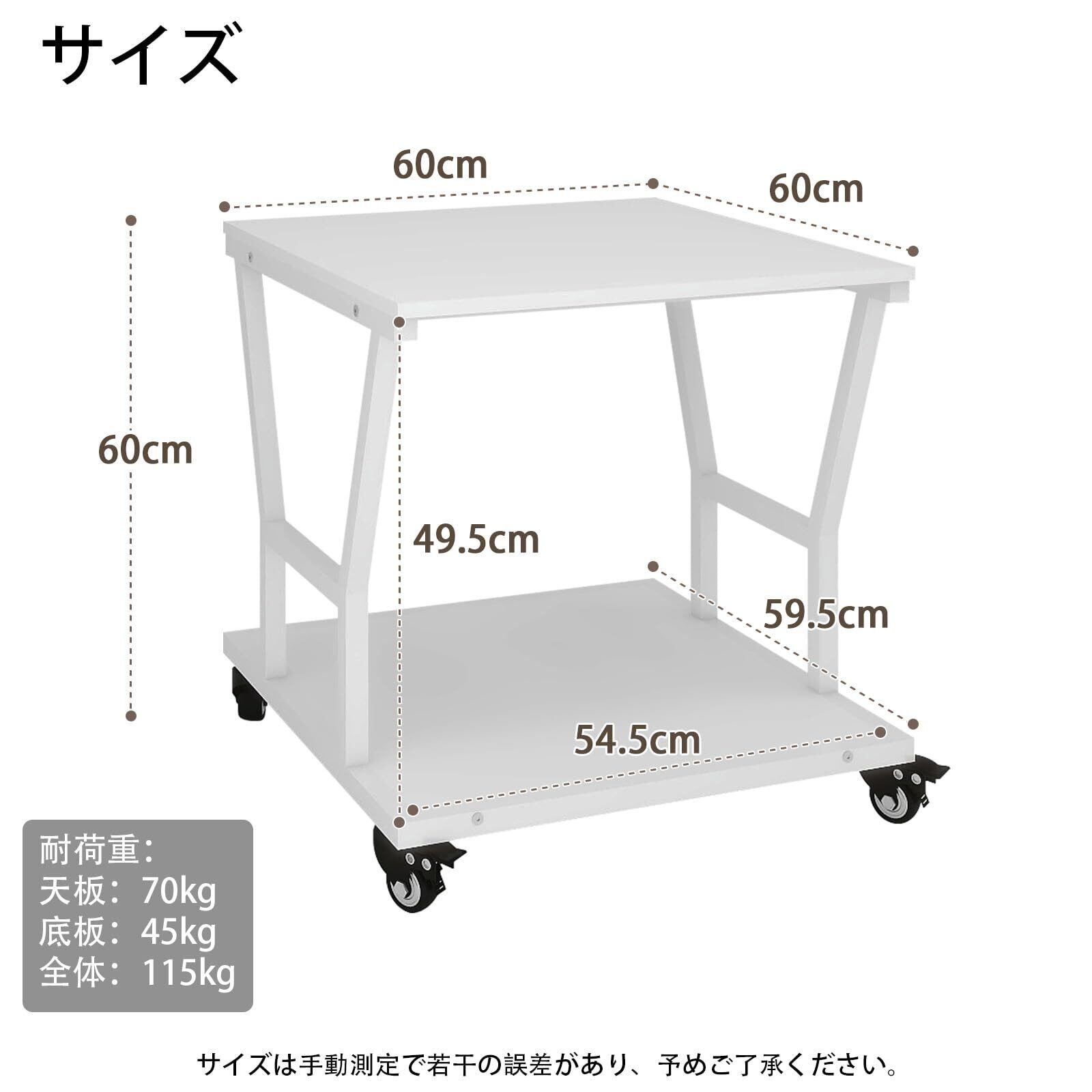 【取付簡単】お一人でも簡単に組み立てをしていただけます。説明書に従っていただければ20分ほどで完成いたします。完成品サイズ:幅60 X奥行60 X高さ60 cm、耐荷重が115kgで、大型プリンター向けに設計された。