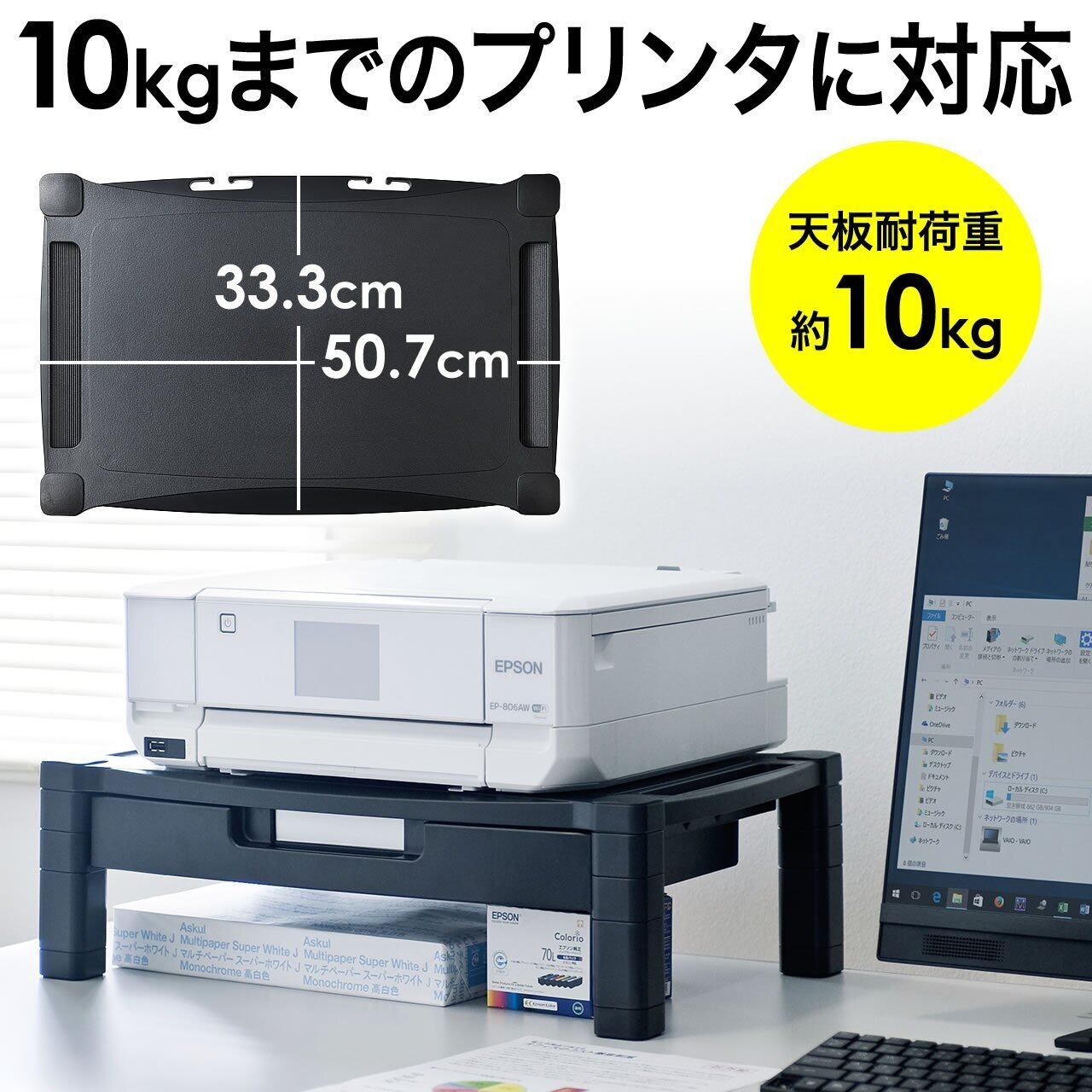 収納物に合わせて脱着できる仕切り板を2枚付属しています。10kgまでのプリンタの設置に対応しています。プリンタ台としてだけでなく、机上台やモニタ台としても使用できます。