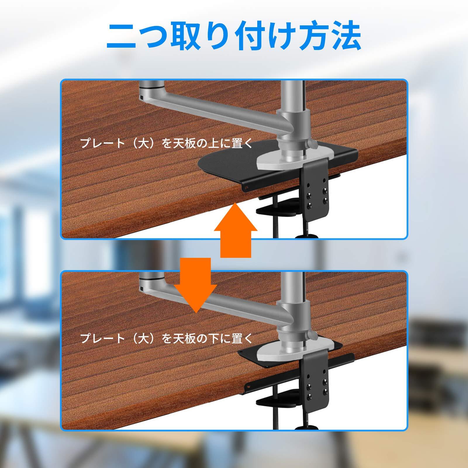 モニタアームのクランプの接地面積が少ない場合には、机の損傷を低減するためにプレート(大)をデスク下のクランプに挟み込むこともできます。