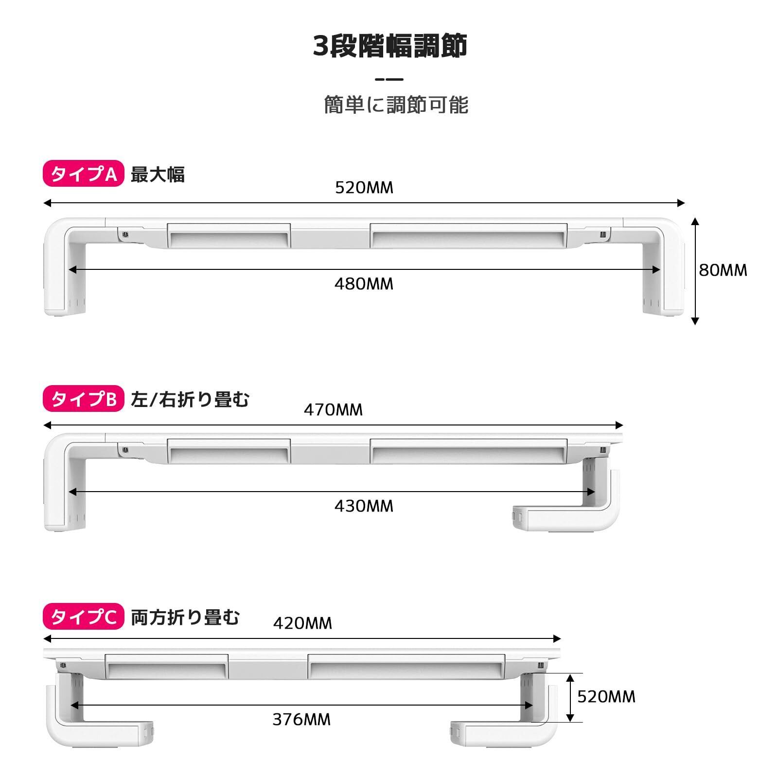 三段階の幅調整可能:モニター台をご自身の好みとデスクの広さに合わせて、横幅を三段階(420mm、470mm、520mm)に調節できます。さまざまなモニターをサポートできます。
