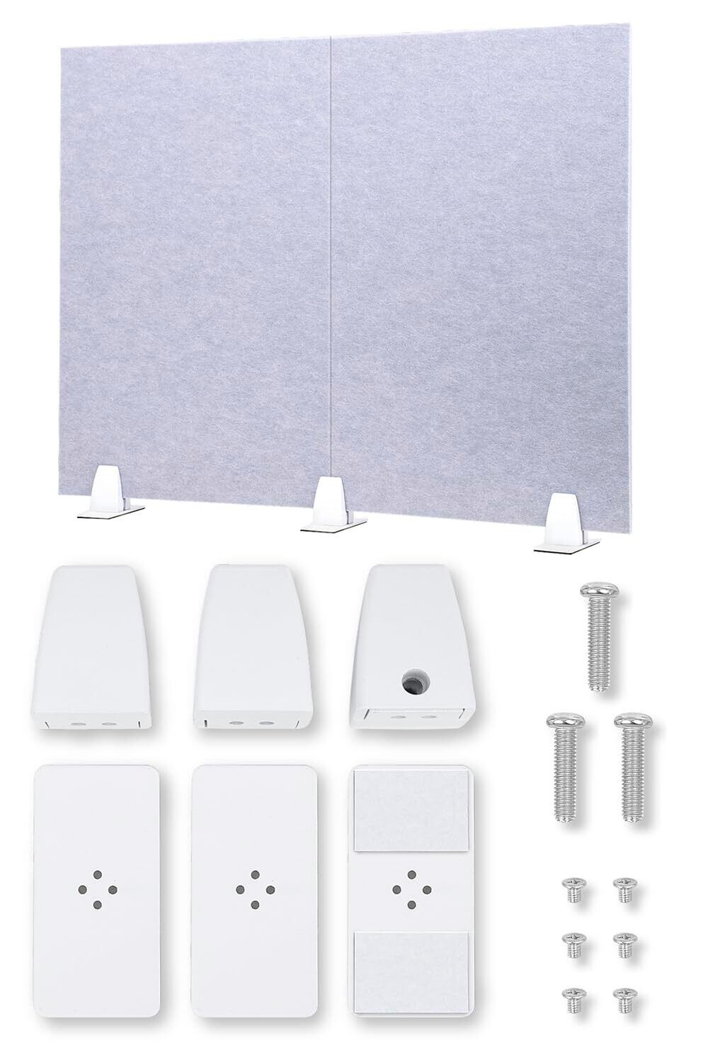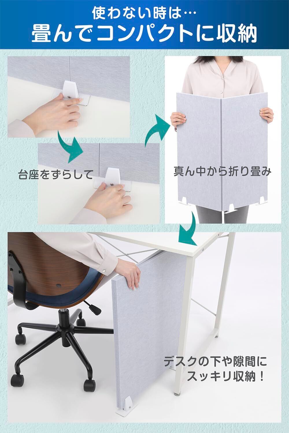 使わない時は畳んで収納 : デスクの下にも仕舞えます。商品セット内容: パーテーション本体 1枚、台座(板・クリップ)各3つ、ネジ小 6本、ネジ大 3本 ※ドライバーは付属していません。