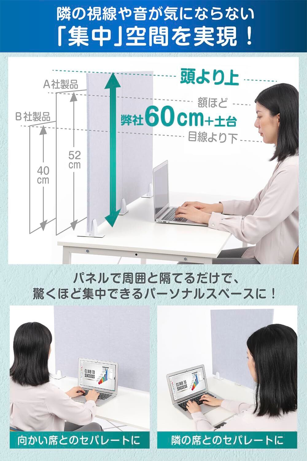 視線が気にならない集中空間 : 卓上から高さは一般的な40〜50cmでは無く、60cm にアップグレード。完璧に視界をシャットアウト。