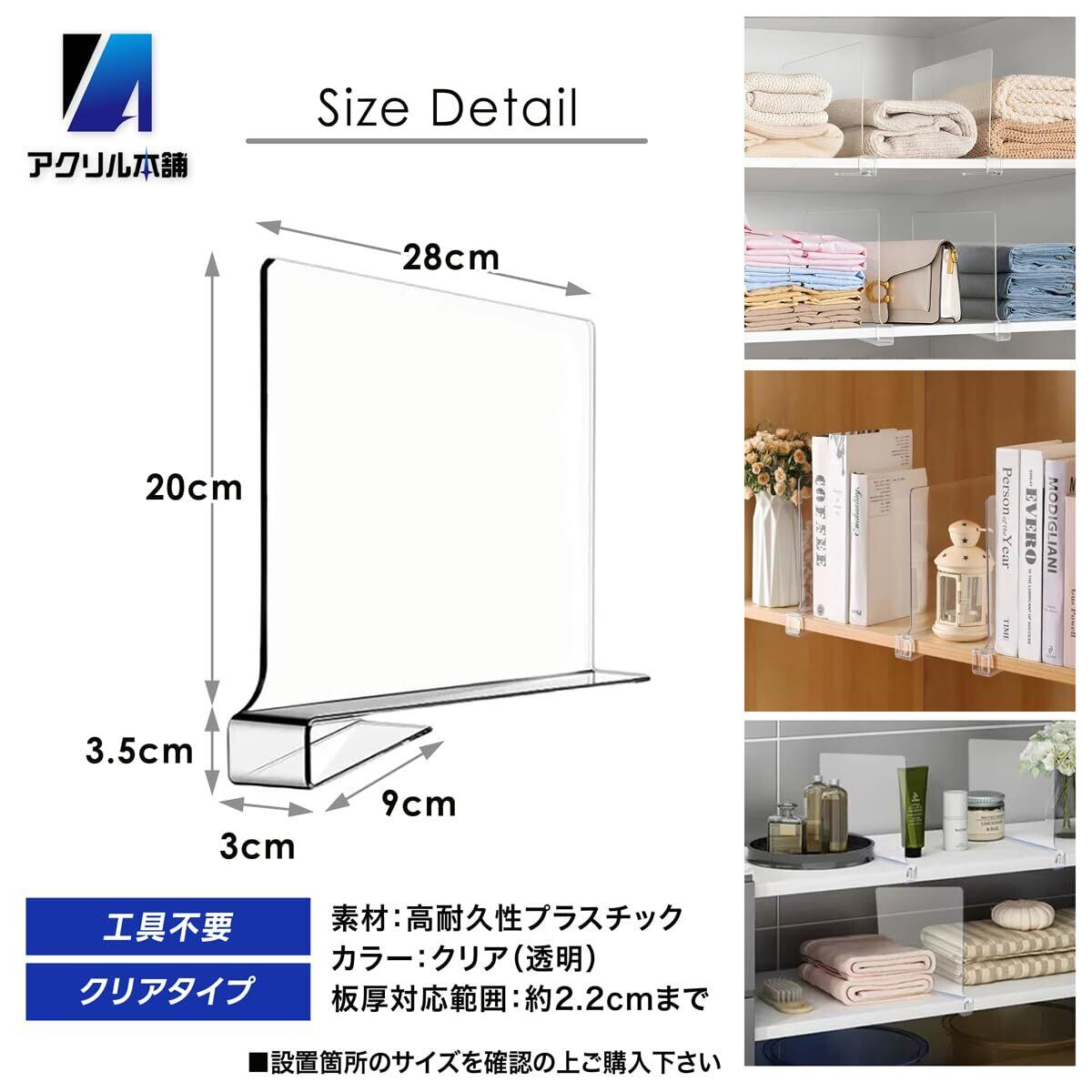 【商品仕様】・サイズ(約):パネル部28cm × 20cm、固定バックル幅3cm/高さ3.5cm/奥行9cm・対応棚板厚み:2〜2.4cm未満の棚板に対応・カラー:クリア(透明)・素材:高耐久プラスチック・セット内容:4個セット/6個セットの2タイプ展開※モニター環境により、商品画像と実際の色味に差が出る場合があります。棚板の厚さを必ずご確認のうえご購入ください。