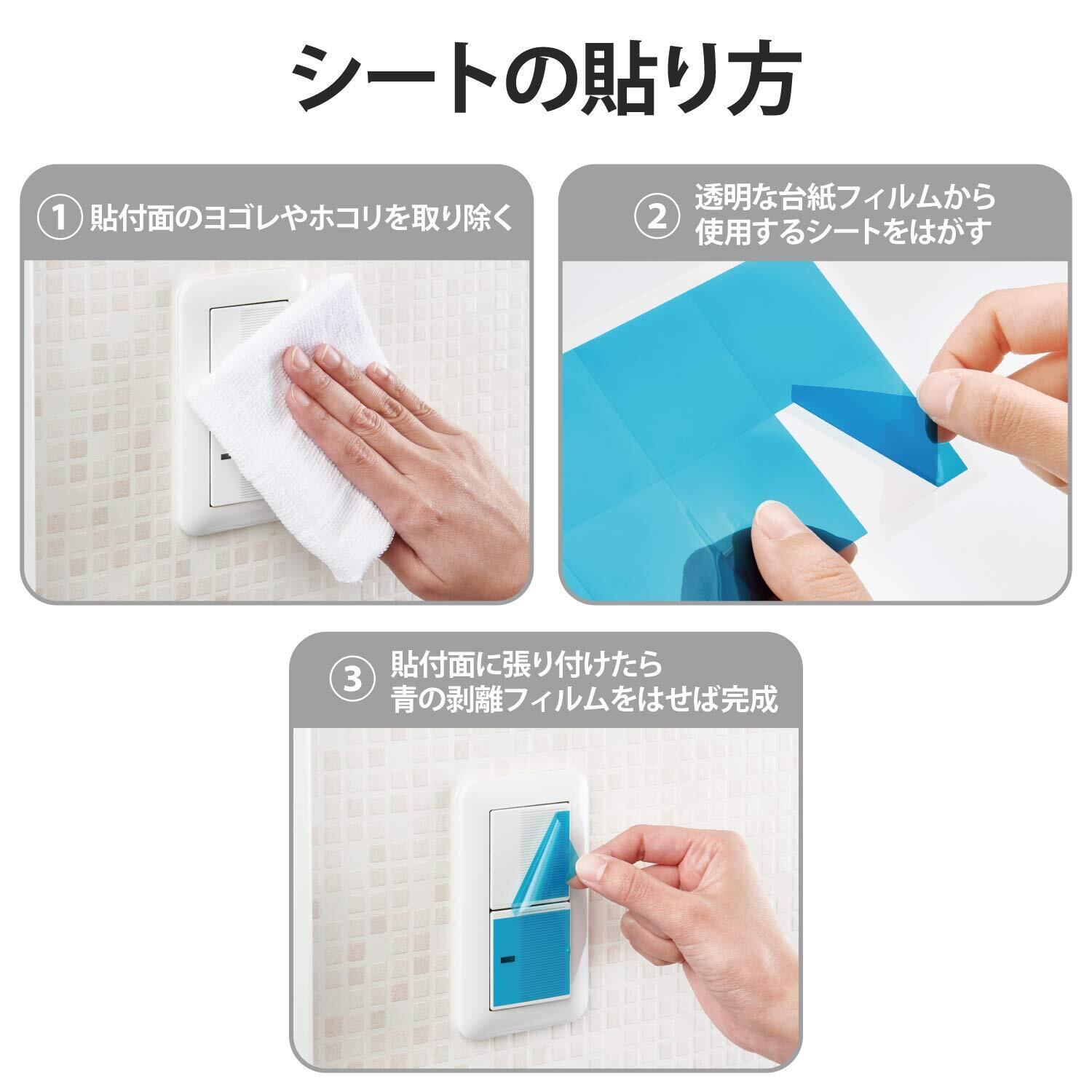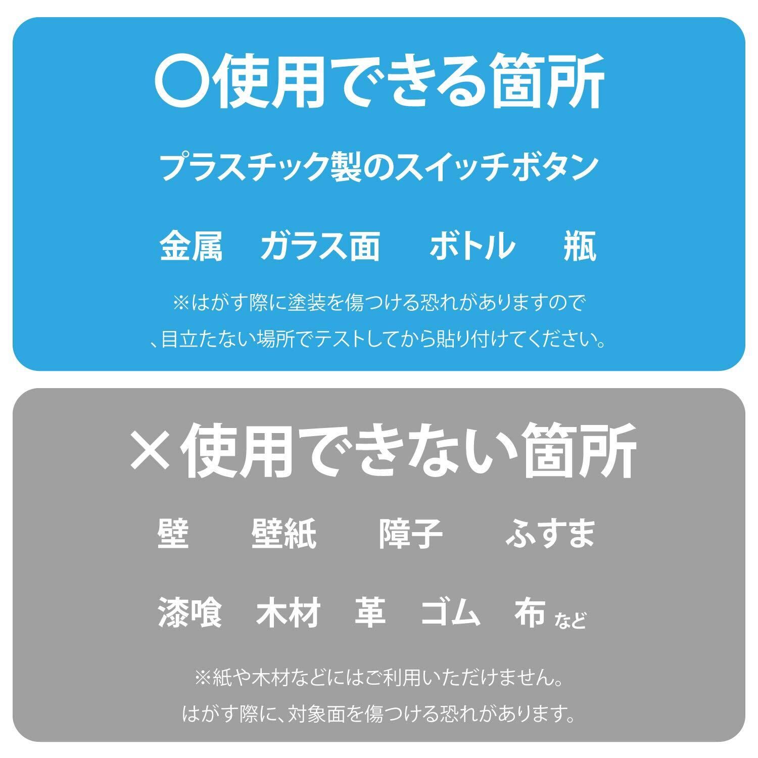 ■ ご利用いただける箇所:金属やプラスチック製のスイッチボタン、ガラス面、ボトル、瓶など。※はがす際に塗装を傷つける恐れがありますので、目立たない場所でテストしてから貼り付けてください。