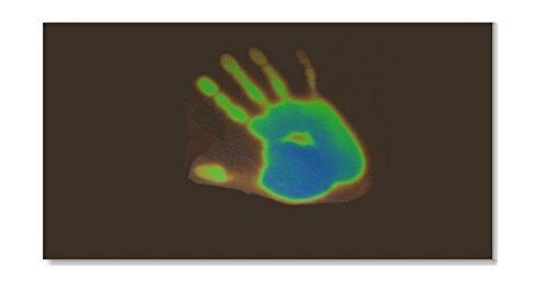 液晶サーモグラフシートは透明なポリエステルフィルムにカプセル化された液晶インクを塗布し、裏面を粘着にしたシートです。微小なカプセルに封入された液晶は、温度によって分子構造が変化し、ねじれ現象を起こします。ねじれの度合いによって、反射される光線の波長が異なり、結果として「温度の違い=色の違い」となります。サーモグラフは被写体を専用のカメラで撮影することで温度分布を色によって表す特殊な画像のことですが、この液晶シートによって示される温度のパターンがあたかもサーモグラフのように見えることから、(株)シータスクでは「液晶サーモグラフシート」という名称で呼んでいます。液晶サーモグラフシートの材料である液晶インク(クロマティック液晶)は温度変化に対する色の変化がはやく、発色がよいという特長があります。反面、使用環境、経年変化によって変色温度がシフトする傾向があり、生産ロットによっても多少色合いがことなる場合がございます。このため科学館などで展示品に液晶サーモグラフシートを貼り付けて長期間お使いいただく場合、初回ご購入時と次回以降のご購入時で「同じ温度なのに、色合いがことなる」という現象も起こりえますので、ご採用前にお問い合せいただきますよう、お願いいたします。