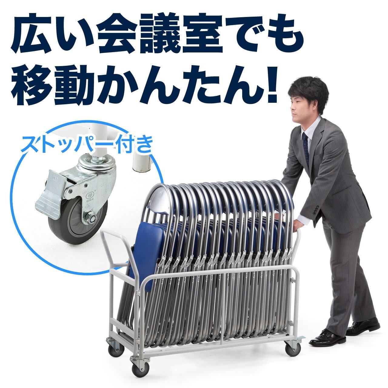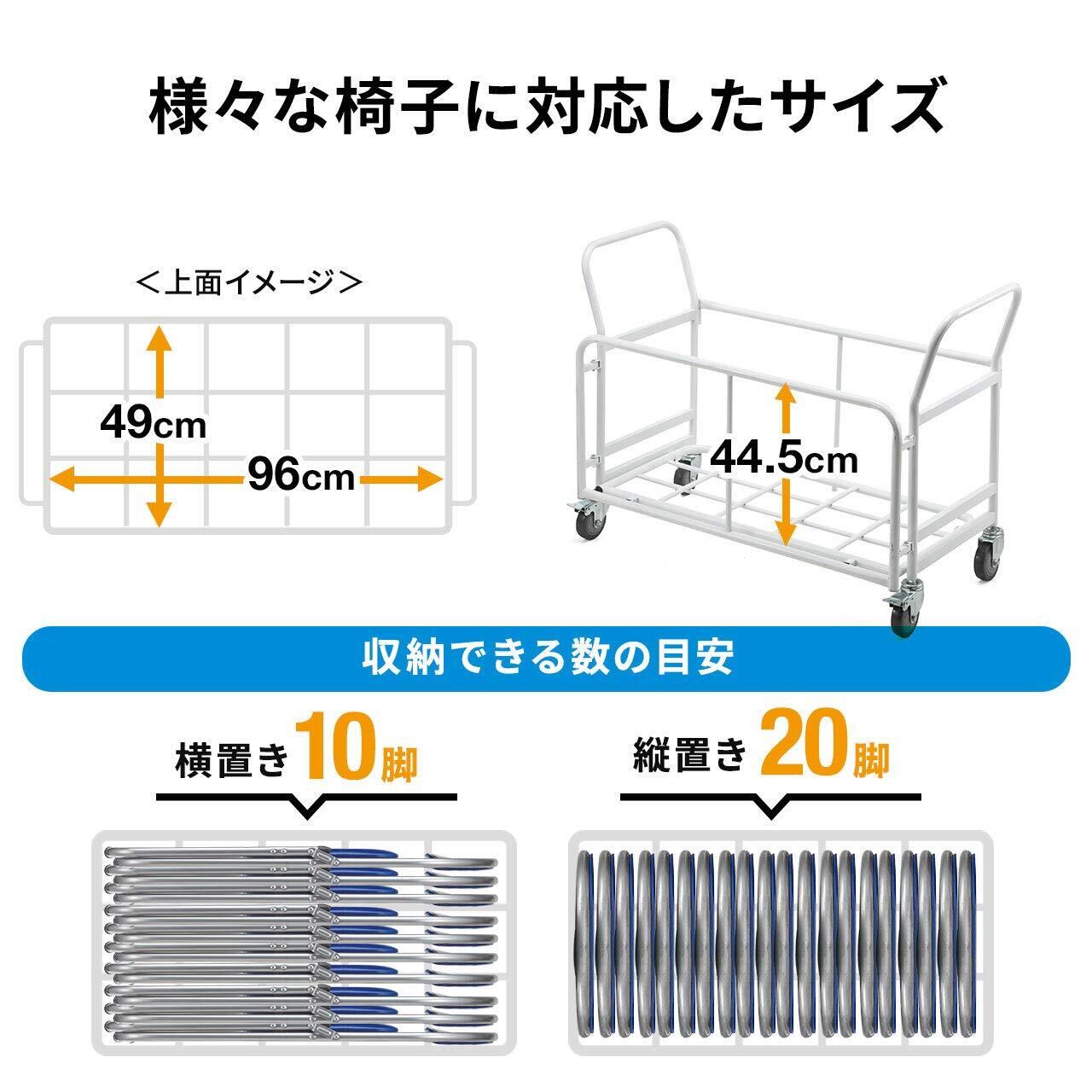150-SNC122シリーズを横置きで10台、縦置きで20台収納できます。一度にたくさんの椅子を 運ぶ のにも、椅子の 収納器具 としても便利な 収納台車 です。