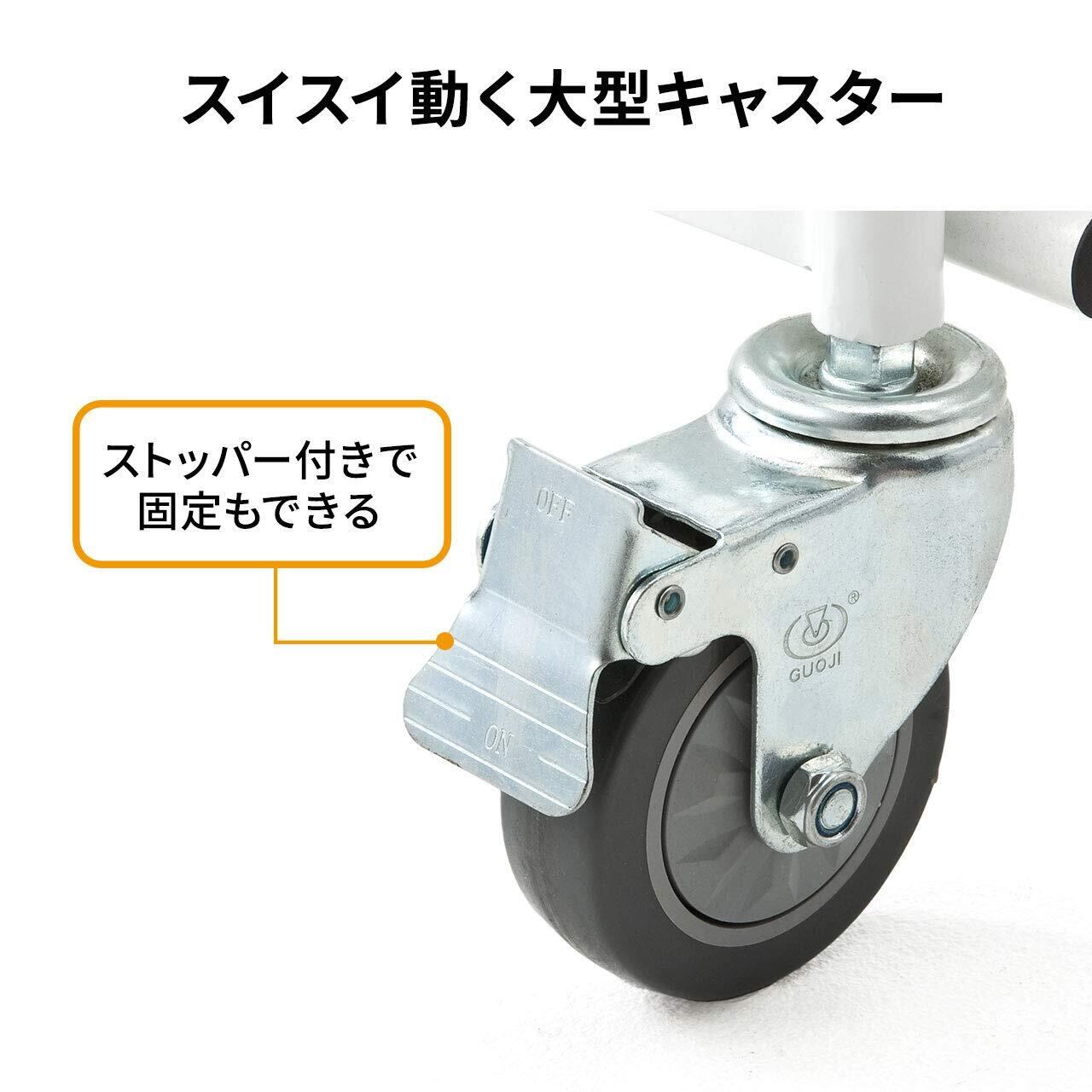 4個の キャスター の内2個はストッパー付きで台車の固定ができ、また広い会議室でも移動が簡単です。組立は、大人1人で約5分の簡単組立です。