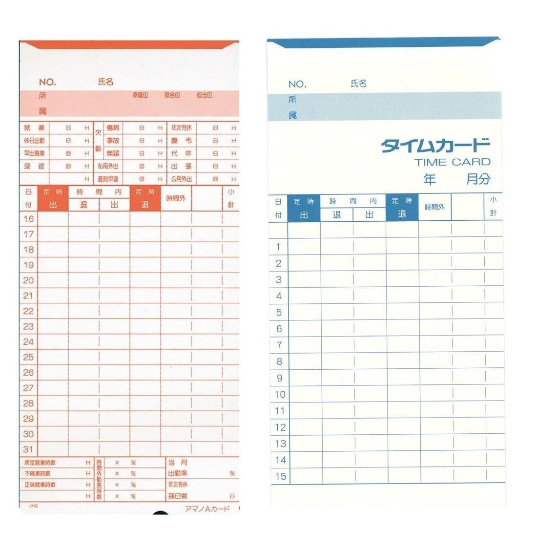 アマノタイムレコーダー用の純正タイムカードです
